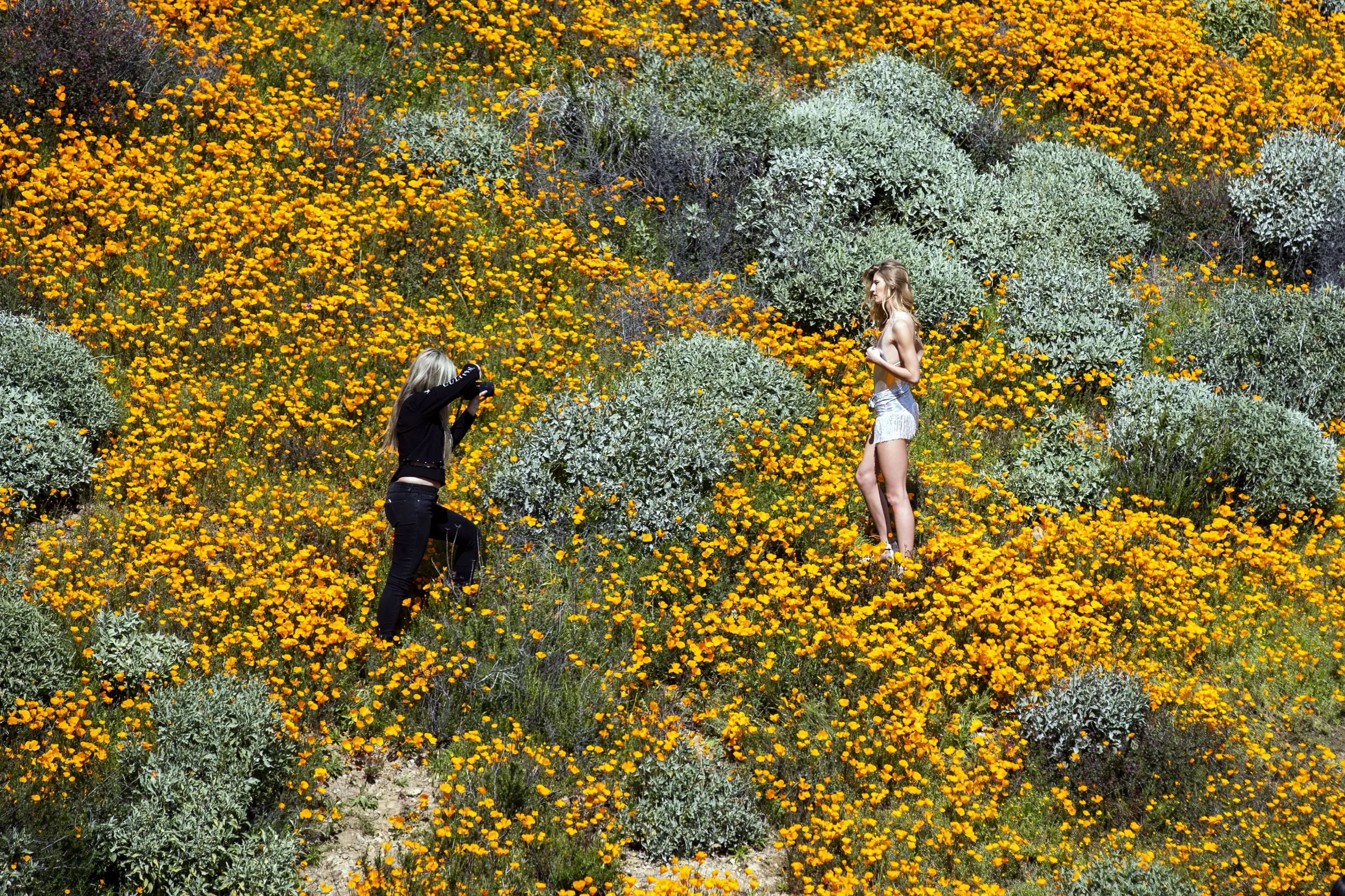 Girls take “fashion” pictures of each other in the middle of a poppy fields on a slop of Walker Canyon near Lake Elsinore, California, USA, 08 March 2019. The heavy rains in California have boosted the growth of wild desert flowers, an occurrence called super bloom. (Photo by Etienne Laurent/EPA/EFE)