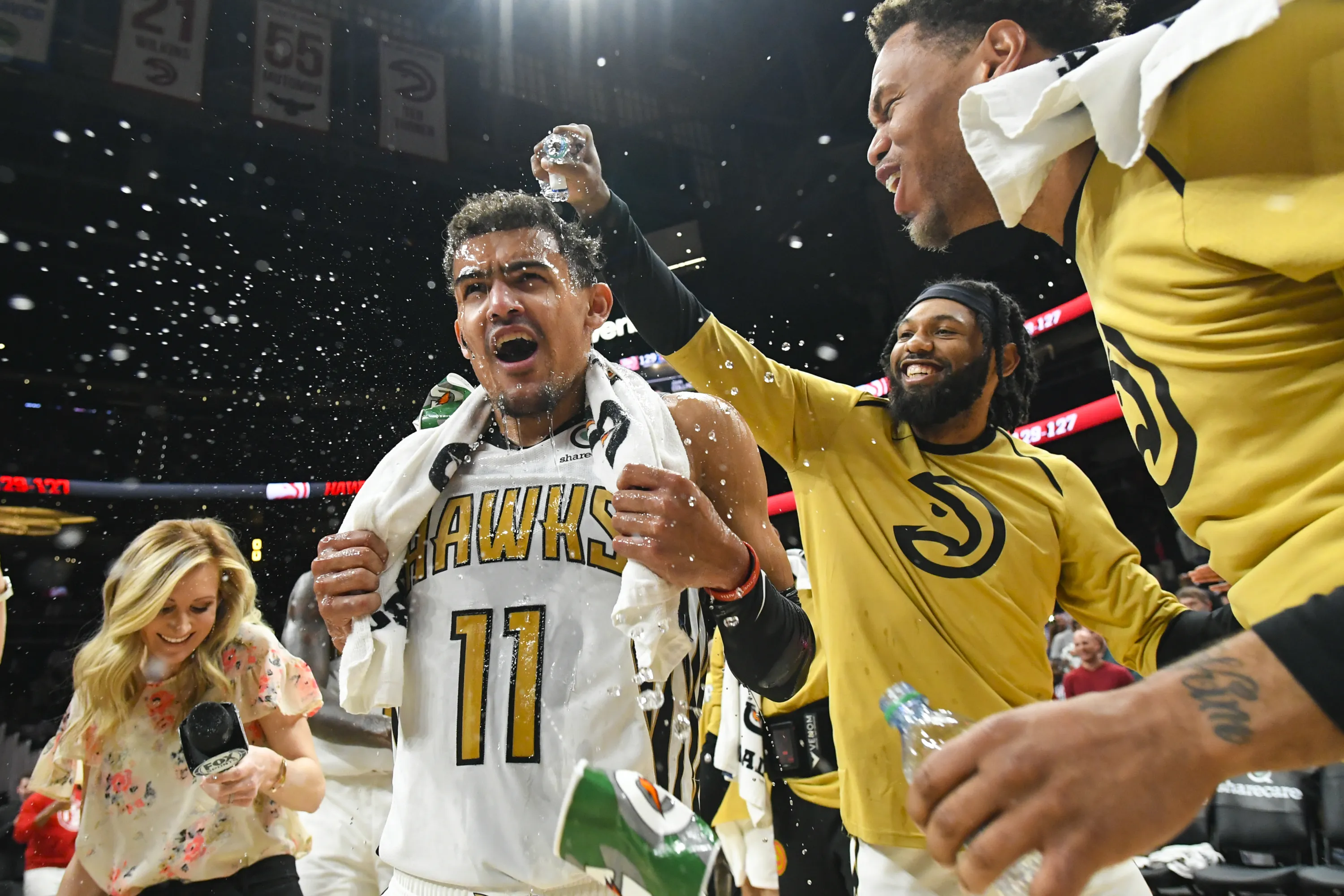 Atlanta Hawks guard Trae Young (11) is doused by forward DeAndre' Bembry as they and Justin Anderson, right, celebrate after Young's winning basket against the Philadelphia 76ers in an NBA basketball game Saturday, March 23, 2019, in Atlanta. (Photo by John Amis/AP Photo)