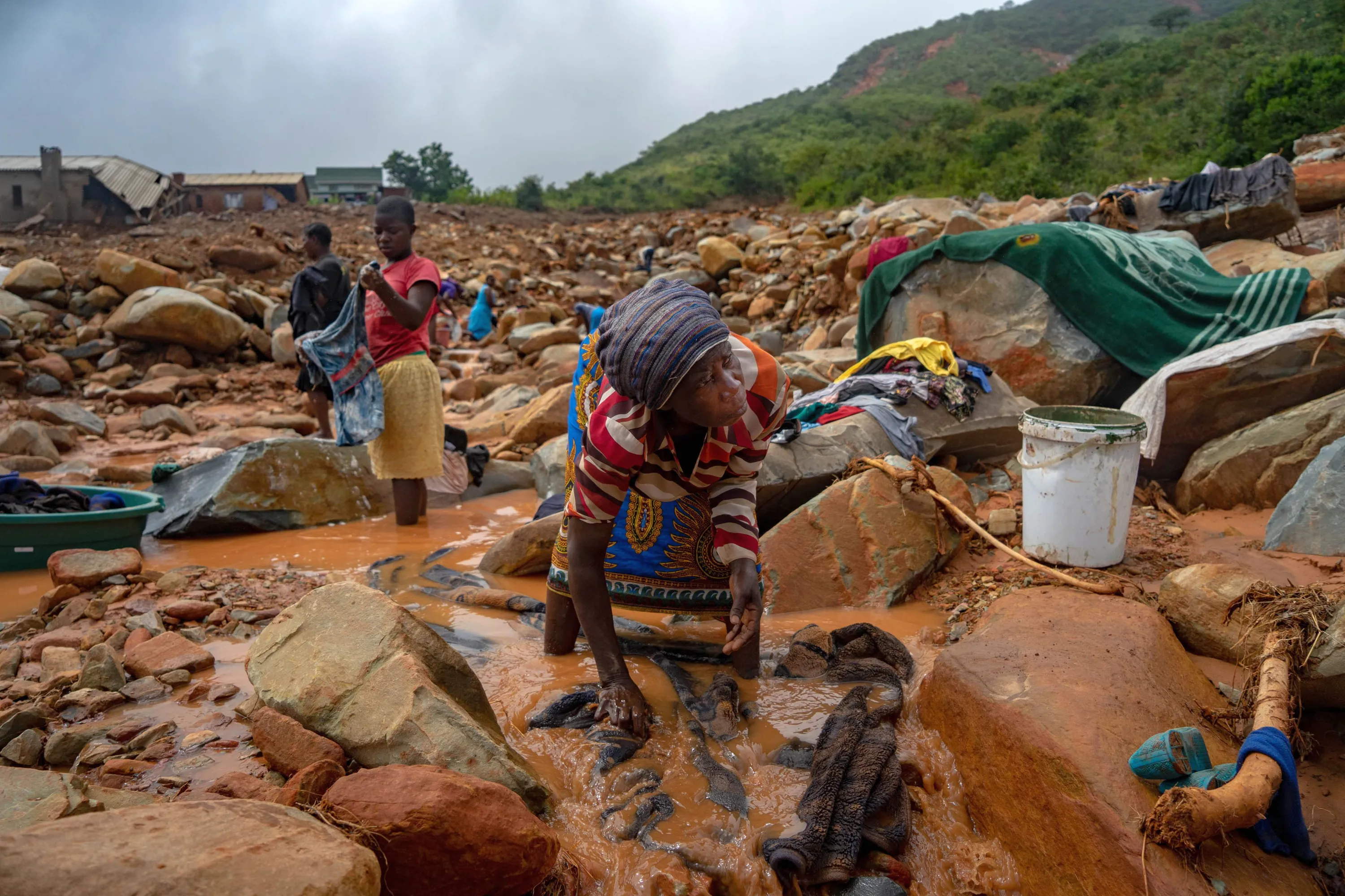 An elderly woman washes her belongings in the mud on March 19, 2019, in Chimanimani, after the area was hit by the Cyclone Idai. More than a thousand people are feared to have died in Mozambique alone while scores have been killed and more than 200 are missing in neighbouring Zimbabwe following the deadliest cyclone to hit southern Africa. Cyclone Idai tore into the centre of Mozambique on March 14 night before barreling on to neighbouring Zimbabwe, bringing flash floods and ferocious winds, and washing away roads and houses. (Photo by Zinyange Auntony/AFP Photo)