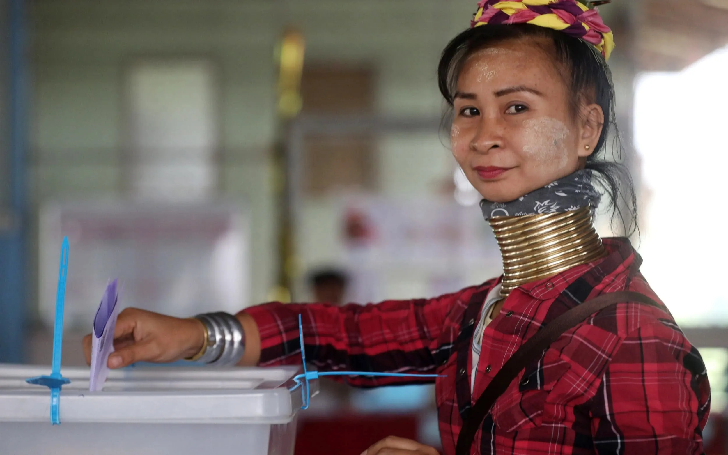 An ethnic Kayan woman, also known as a long neck villager casts her vote for the general election in Mae Hong Son, Thailand, March 24, 2019. (Photo by Ann Wang/Reuters)