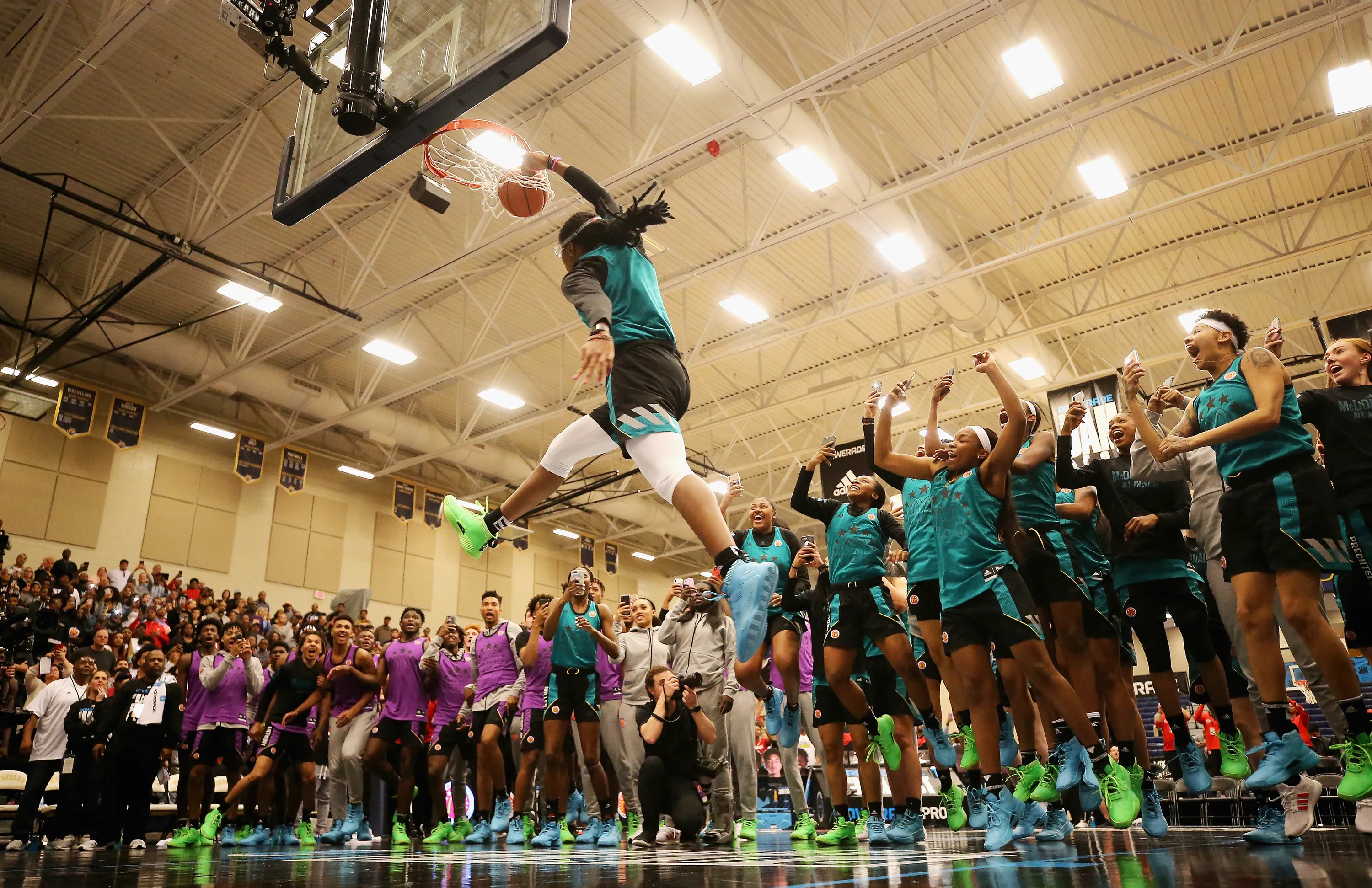 Francesca Belibi competes in the dunk contest during the 2019 Powerade Jam Fest on March 25, 2019 in Marietta, Georgia. (Photo by Mike Ehrmann/Getty Images for Powerade)
