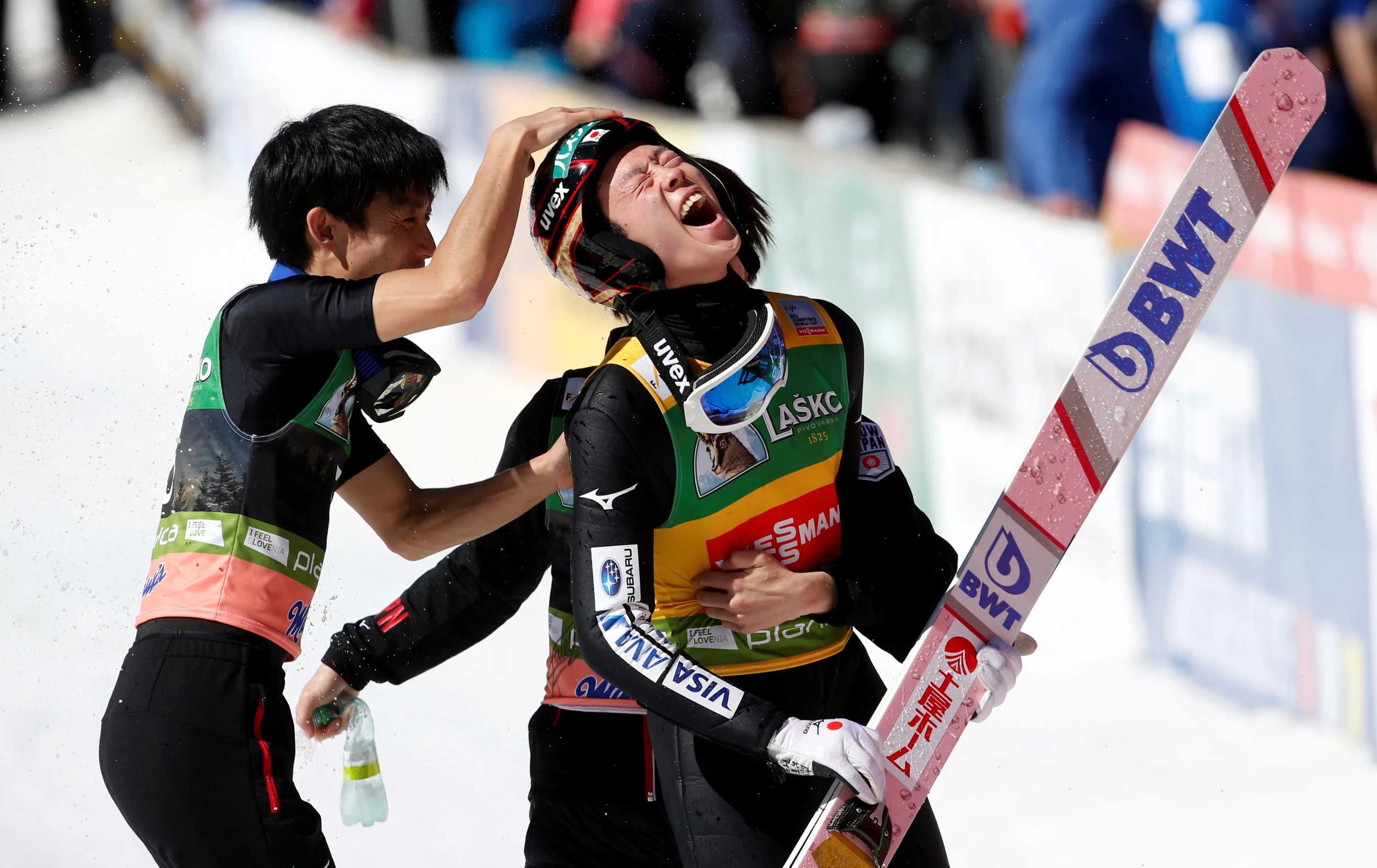 Ryoyu Kobayashi of Japan celebrates after winning the FIS Ski Jumping World Cup Flying Hill Individual competition in Planica, Slovenia on March 24, 2019. (Photo by Borut Zivulovic/Reuters)