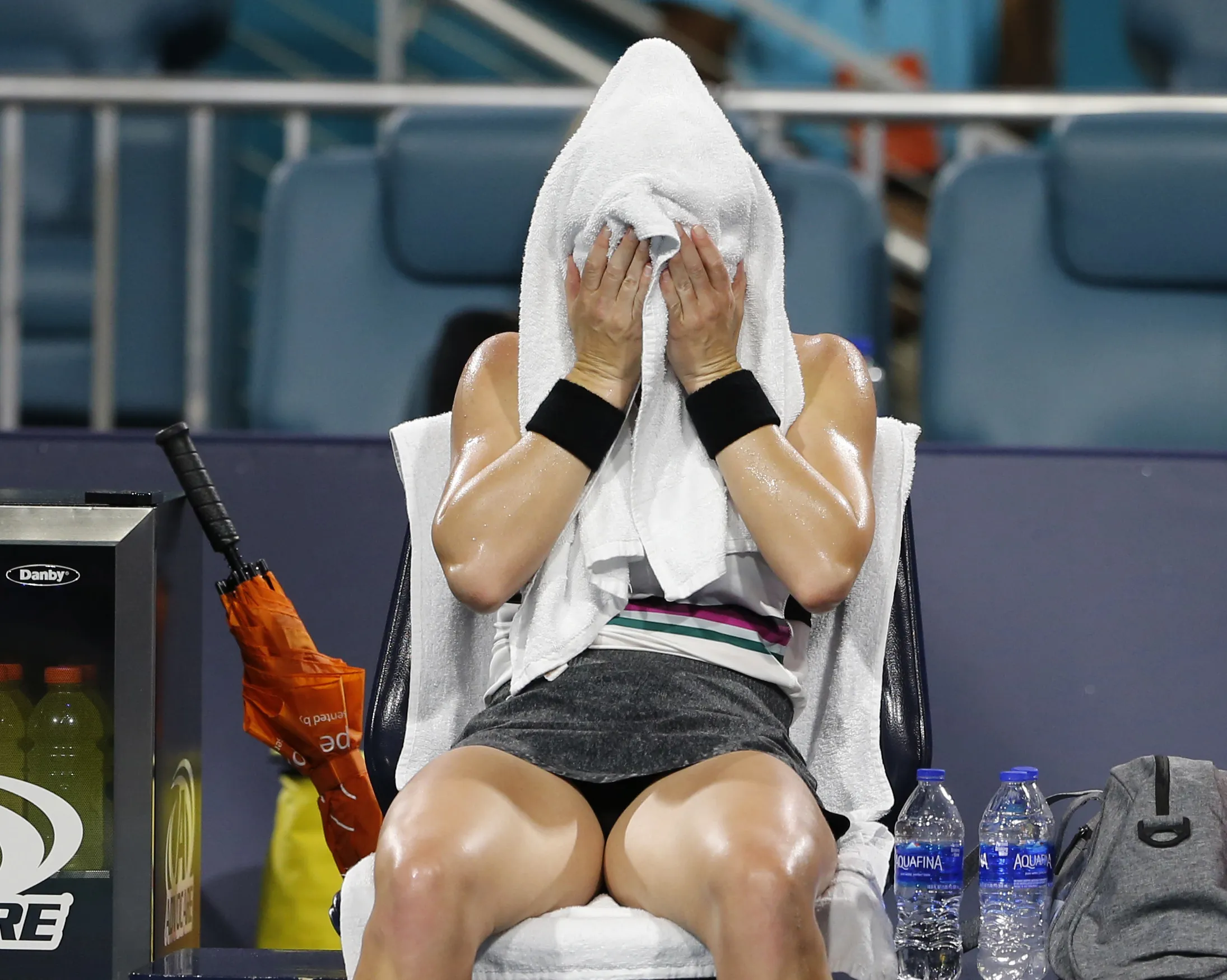 Simona Halep, of Romania, sits with a towel on her face during her match with Karolina Pliskova, of the Czech Republic, during a semifinal in the Miami Open tennis tournament Thursday, March 28, 2019, in Miami Gardens, Fla. (Photo by Joe Skipper/AP Photo)