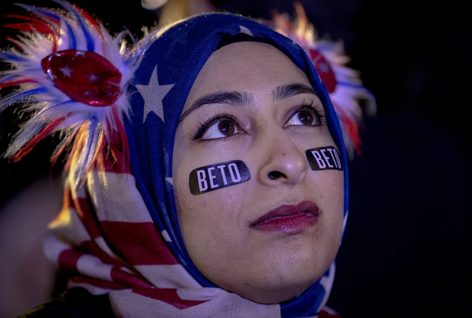 Muna Hussaini listens to Democratic presidential candidate and former Texas congressman Beto O'Rourke speak during a presidential campaign rally kickoff on Saturday, March 30, 2019, in Austin, Texas. (Photo by Kick Wagner/Austin American-Statesman via AP Photo)