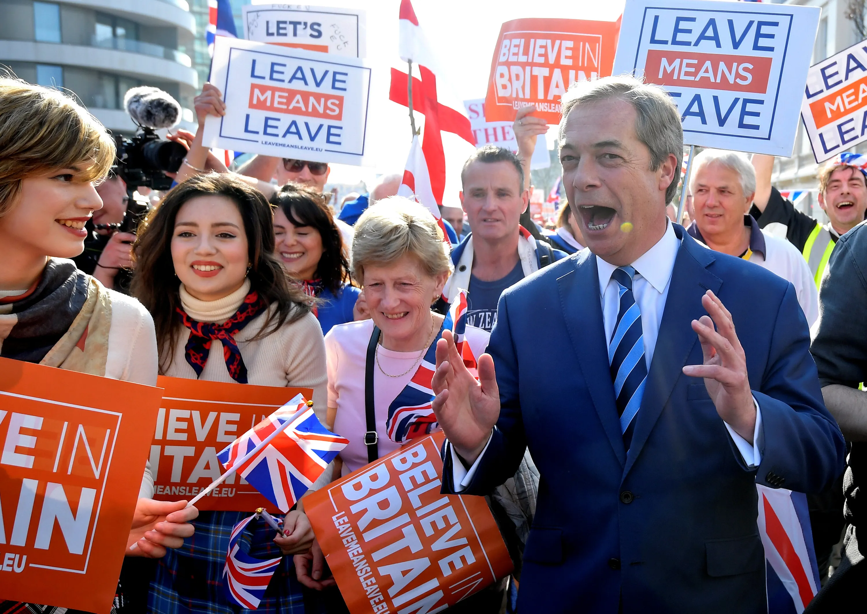 Brexit Party leader Nigel Farage attends a March to Leave demonstration in London, Britain March 29, 2019. The protest march which started on March 16 in Sunderland, north east England, finishes on Friday March 29 in Parliament Square, London, on what was the original date for Brexit to happen before the recent extension. (Photo by Toby Melville/Reuters)