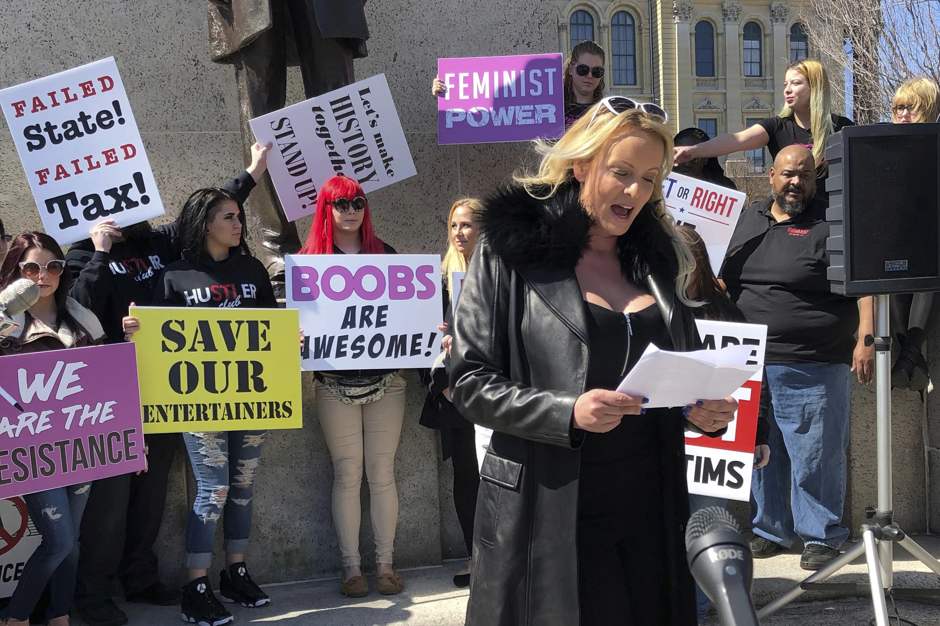Adult film star Stormy Daniels reads a statement, protesting the Illinois surcharge on live adult entertainment centers, beneath the statue of Abraham Lincoln at the state Capitol, Friday, March 22, 2019 in Springfield, Ill. The actress famous for her alleged affair with Donald Trump before he became president read a two-minute statement before she was whisked off to a local strip club to sign copies of her book. Daniels, whose real name is Stephanie Clifford, says the tax unfairly ties nude dancing to violence against women and that it “takes money out of the g-strings of hardworking young dancers”. (Photo by John O'Connor/AP Photo)