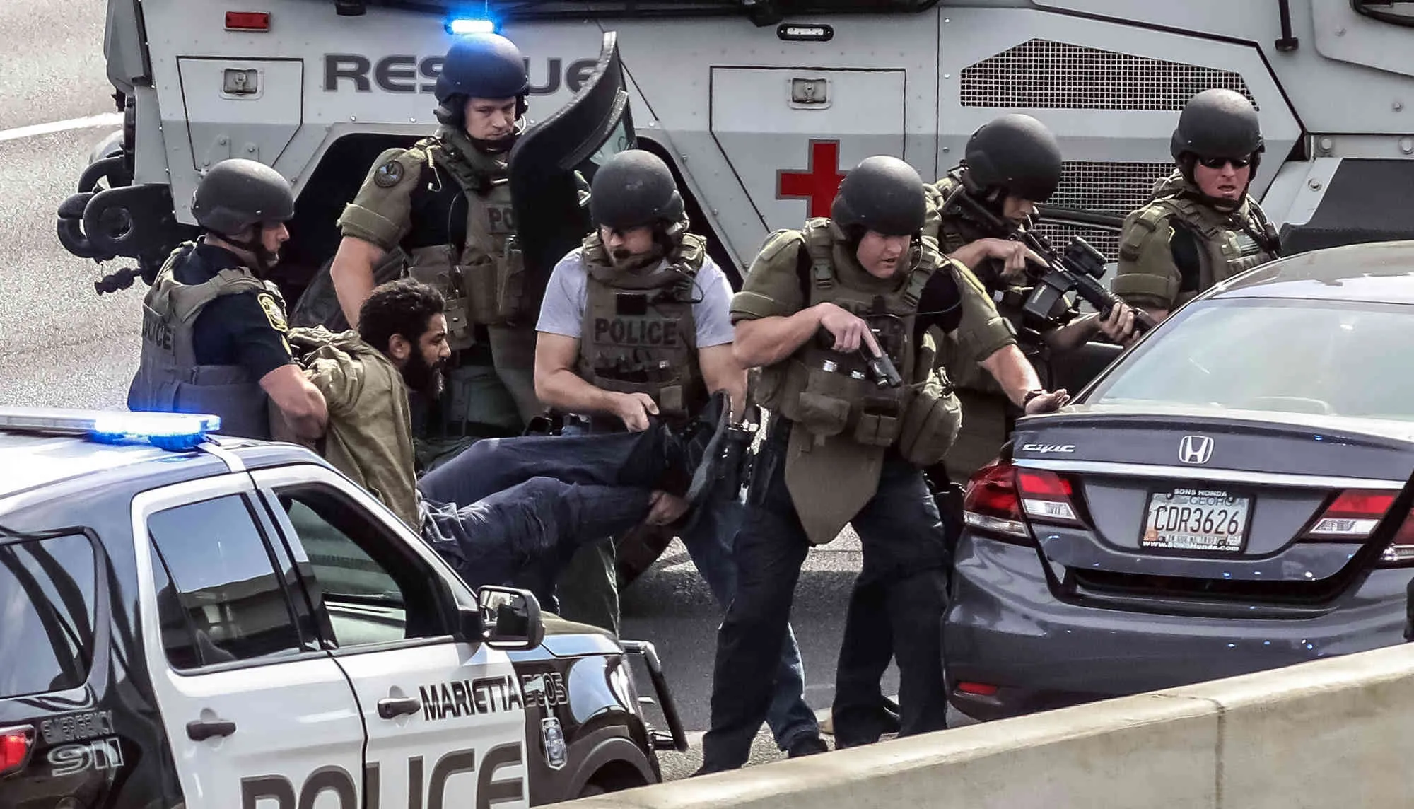 Marietta Police arrest a man after a standoff along the southbound lanes of Interstate 75, Friday, March 29, 2019, near Marietta, Ga., northwest of Atlanta. Marietta police said an armed driver had stopped on the freeway and wasn't cooperating with officers. Police had followed the vehicle to I-75 since it matched the description from an armed robbery nearby. (Photo by John Spink/Atlanta Journal-Constitution via AP Photo)