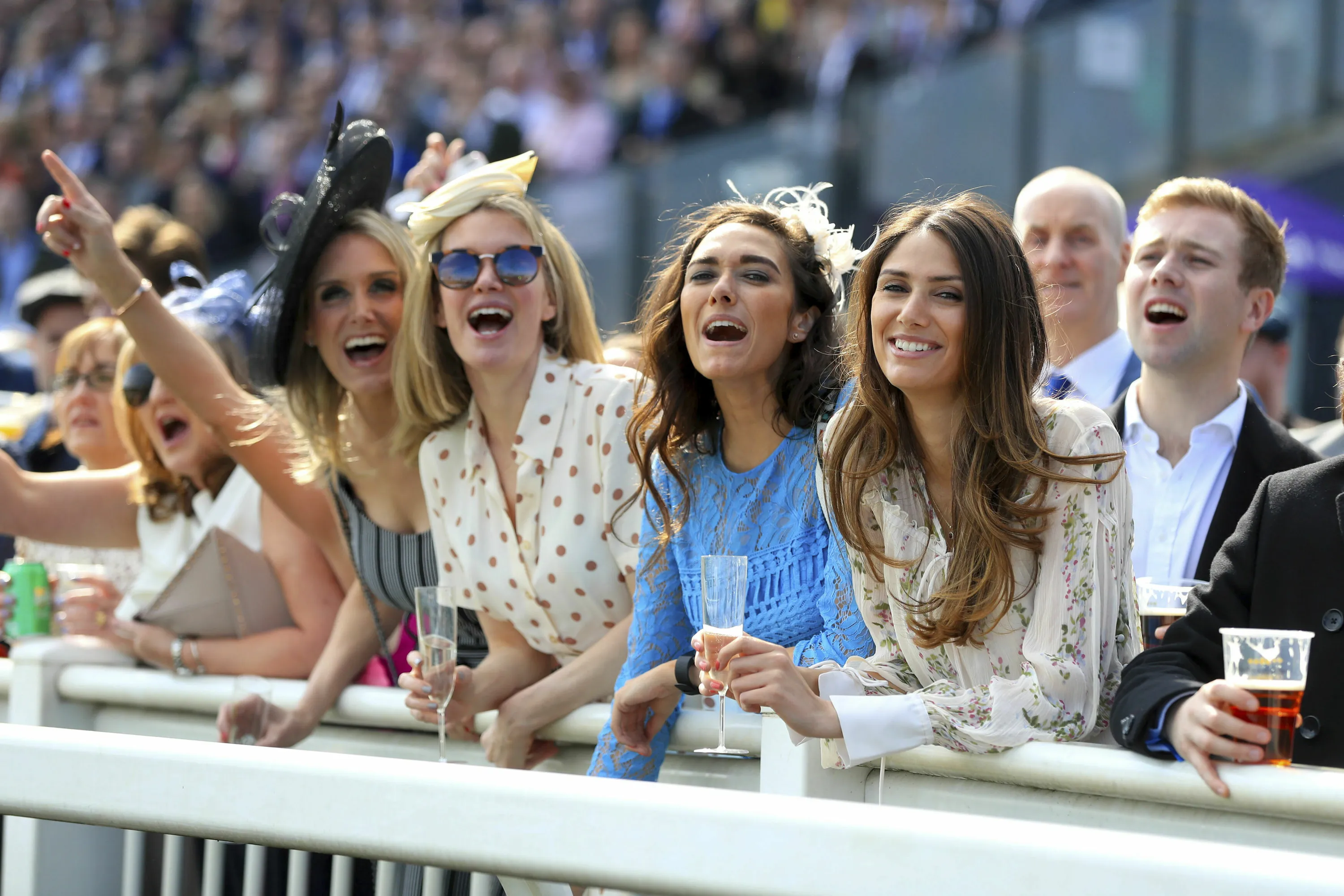 Racegoers at the rails during the premier horse racing day at The Grand National Festival, at Aintree Racecourse in Liverpool, England, Saturday April 6, 2019. 40 horses will compete in the challenging Grand National event later Saturday, with its notoriously high fences spread over a four mile course, attracting large crowds of racegoers and an international TV audience. (Photo by Nigel French/PA Wire Press Association via AP Photo)