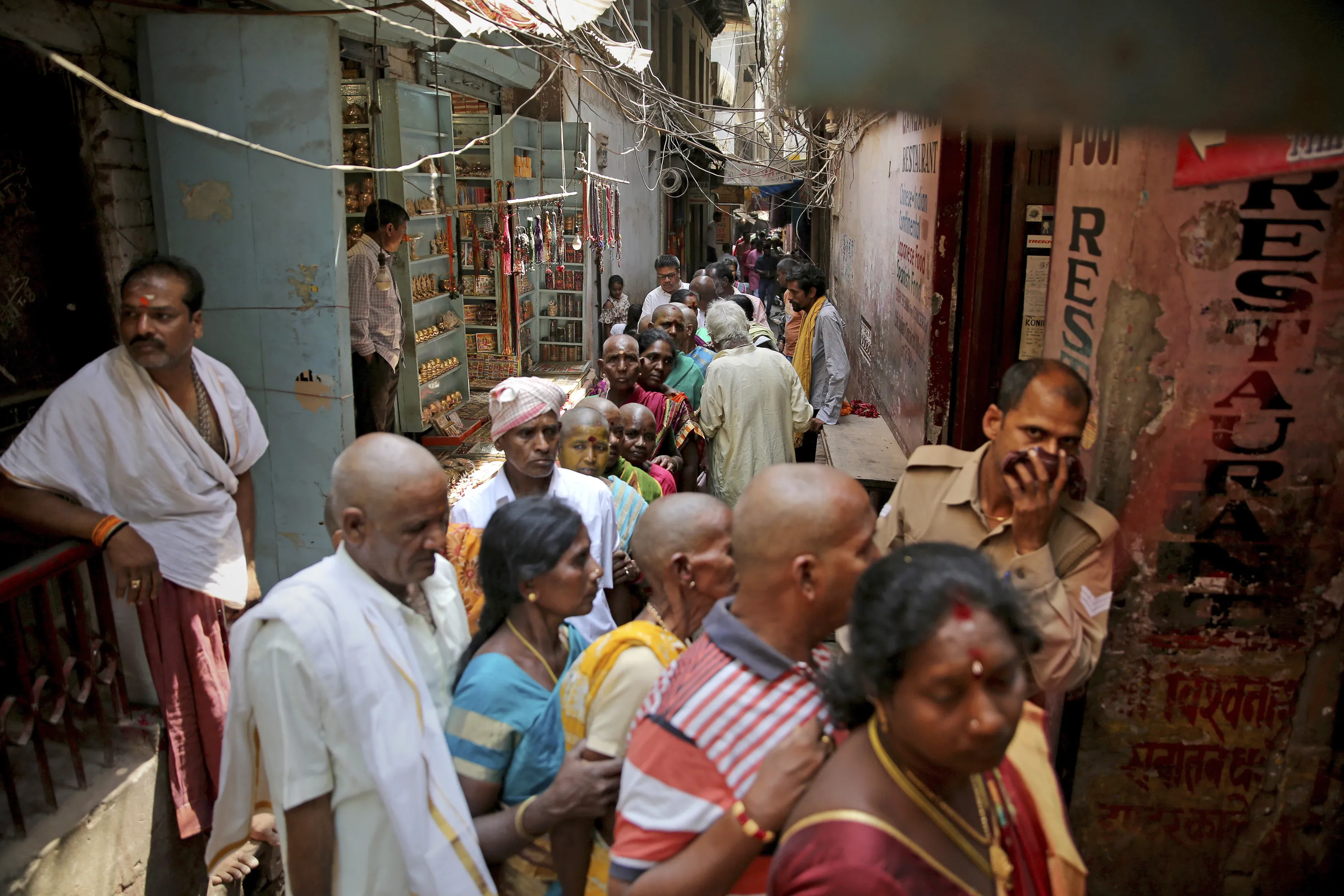 In this March 22, 2019, photo, Hindu devotees stand in queue in a narrow lane to enter into Vishwanath temple, in Varanasi, India. In the Indian city considered the center of the Hindu universe, Prime Minister Narendra Modi has commissioned a grand promenade connecting the sacred Ganges river with a centuries-old Vishwanath temple dedicated to Lord Shiva, the god of destruction. (Photo by Altaf Qadri/AP Photo)