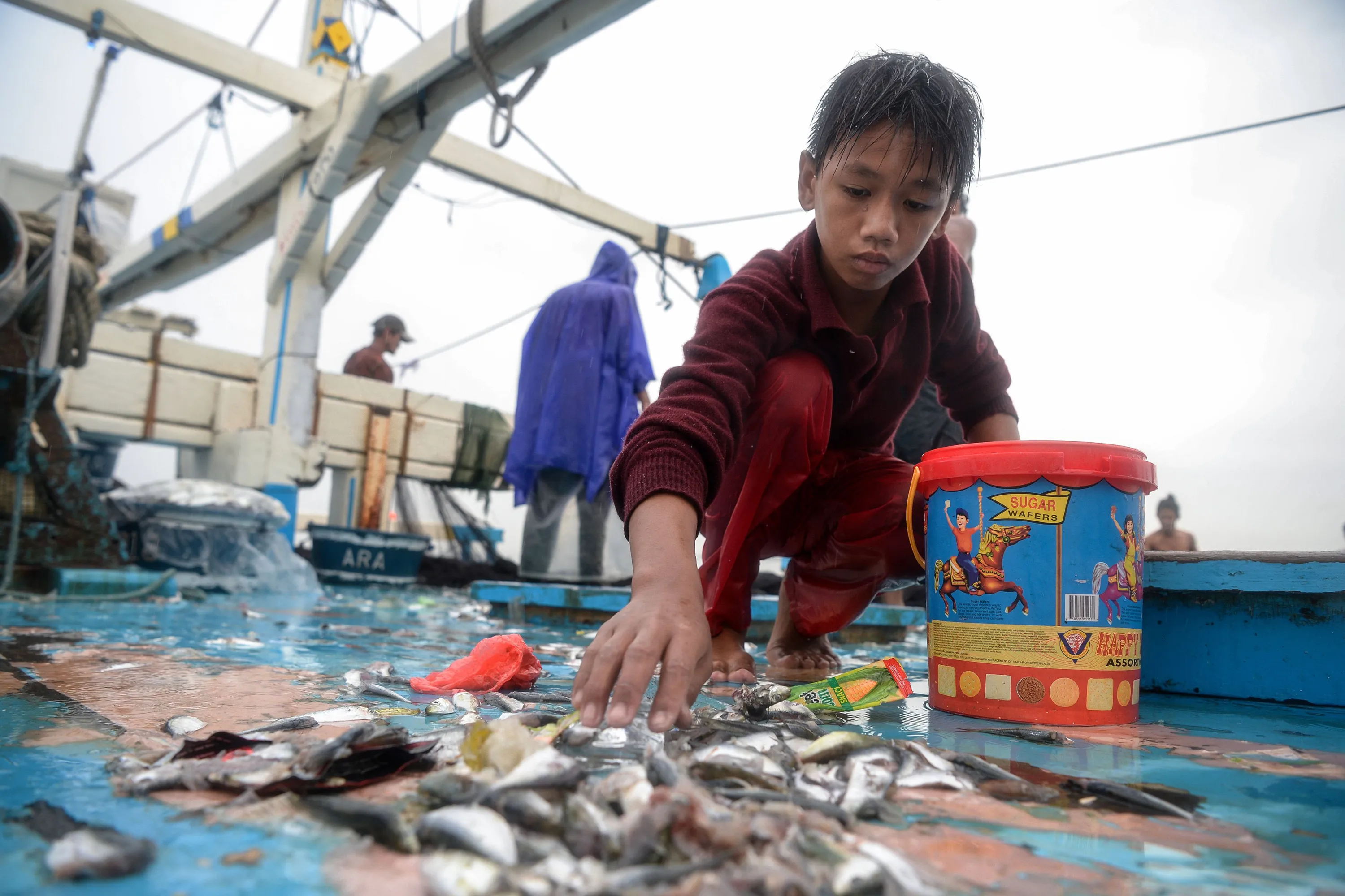 In this photo taken on March 16, 2019, 13-year-old Reymark Cavesirano collects left over herring onboard a fishing boat anchored at the mouth of Manila Bay off Navotas City in suburban Manila. (Photo by Ted Aljibe/AFP Photo)