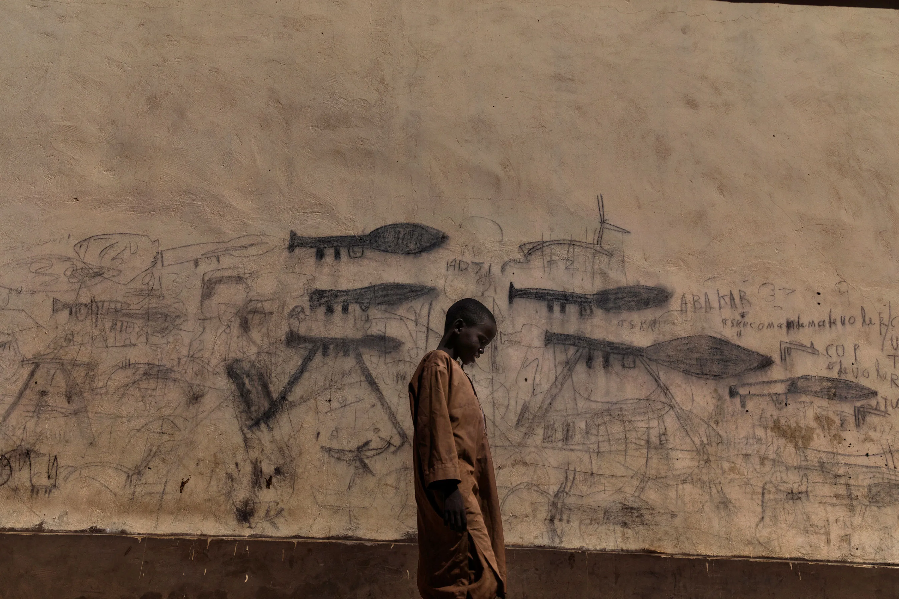 Environment, stories winner: Almajiri Boy, by Marco Gualazzini. An orphaned boy walks past drawings on a wall depicting rocket-propelled grenade launchers, in Bol, Chad. This image was also nominated as part of a set in the “photo story of the year” and “environment story” categories. (Photo by Marco Gualazzini/Contrasto/World Press Photo 2019)
