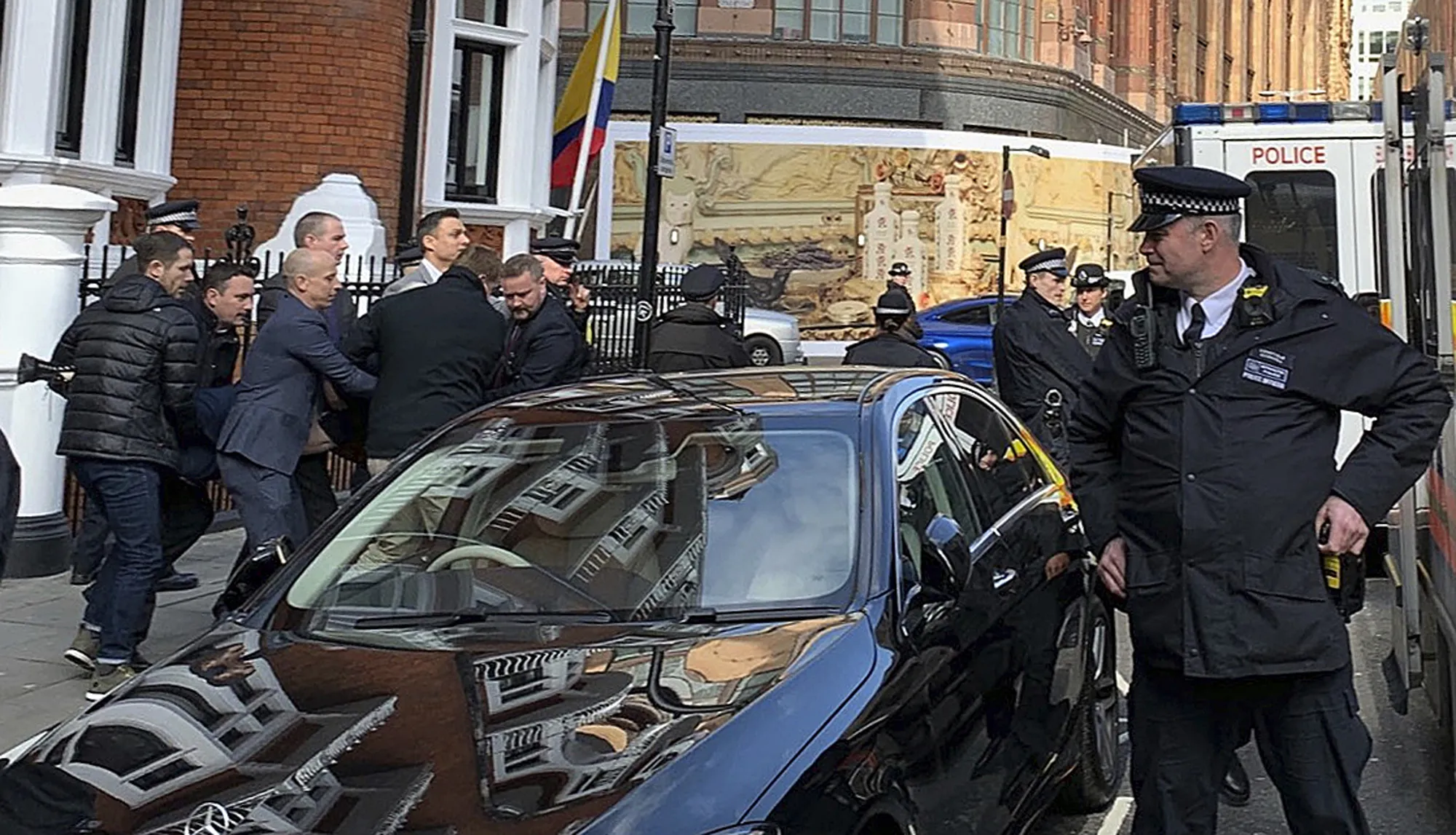 Police carry WikiLeaks founder Julian Assange from the Ecuadorian embassy in London after he was arrested by officers from the Metropolitan Police and taken into custody Thursday April 11, 2019. Police in London arrested WikiLeaks founder Assange at the Ecuadorean embassy Thursday, April 11, 2019 for failing to surrender to the court in 2012, shortly after the South American nation revoked his asylum. (Photo by @DailyDOOH/PA Wire via AP Photo)