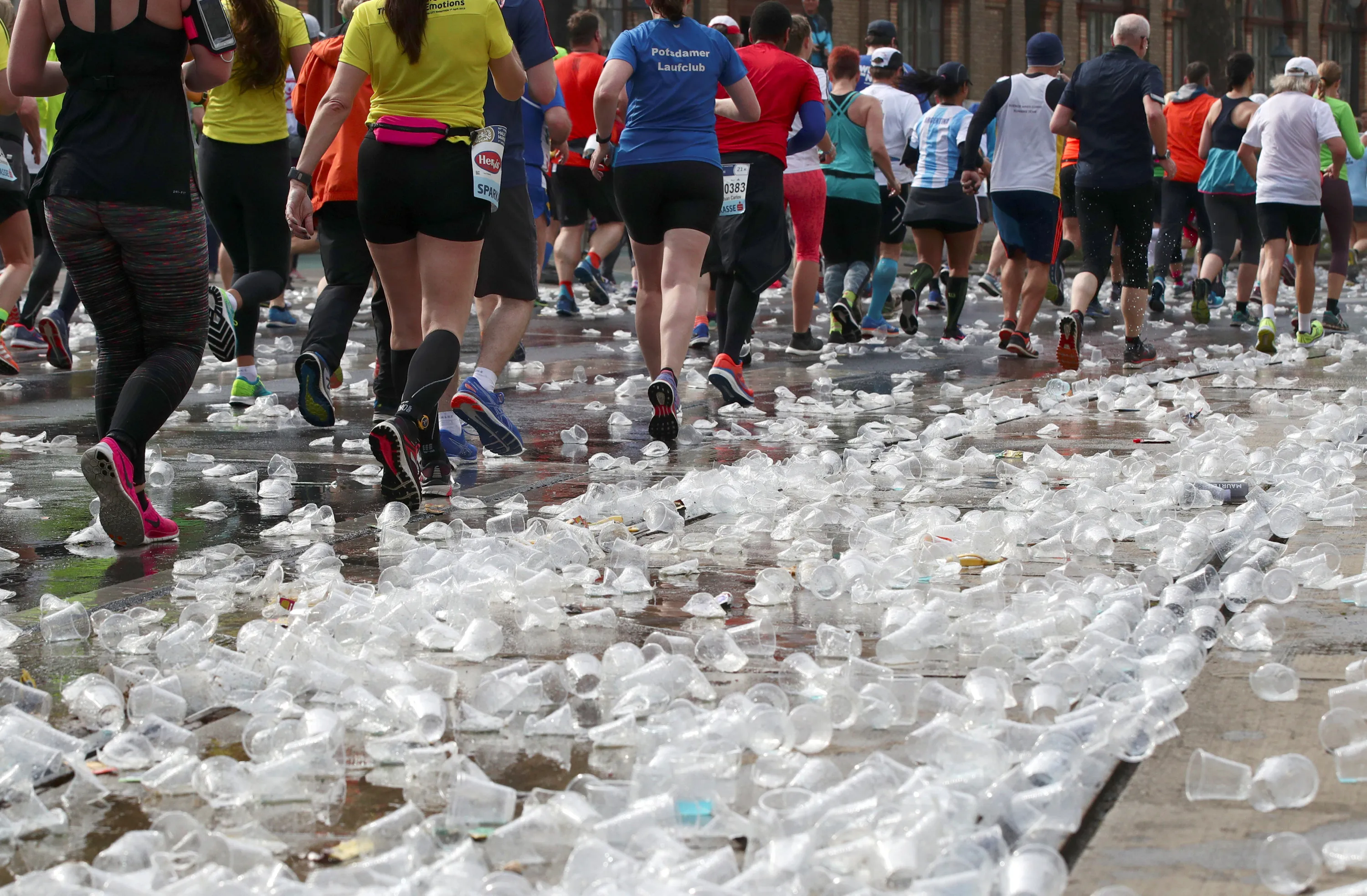 Runners pass along discarded cups at a refreshment point during the Vienna City Marathon in Vienna, Austria, April 7, 2019. (Photo by Lisi Niesner/Reuters)