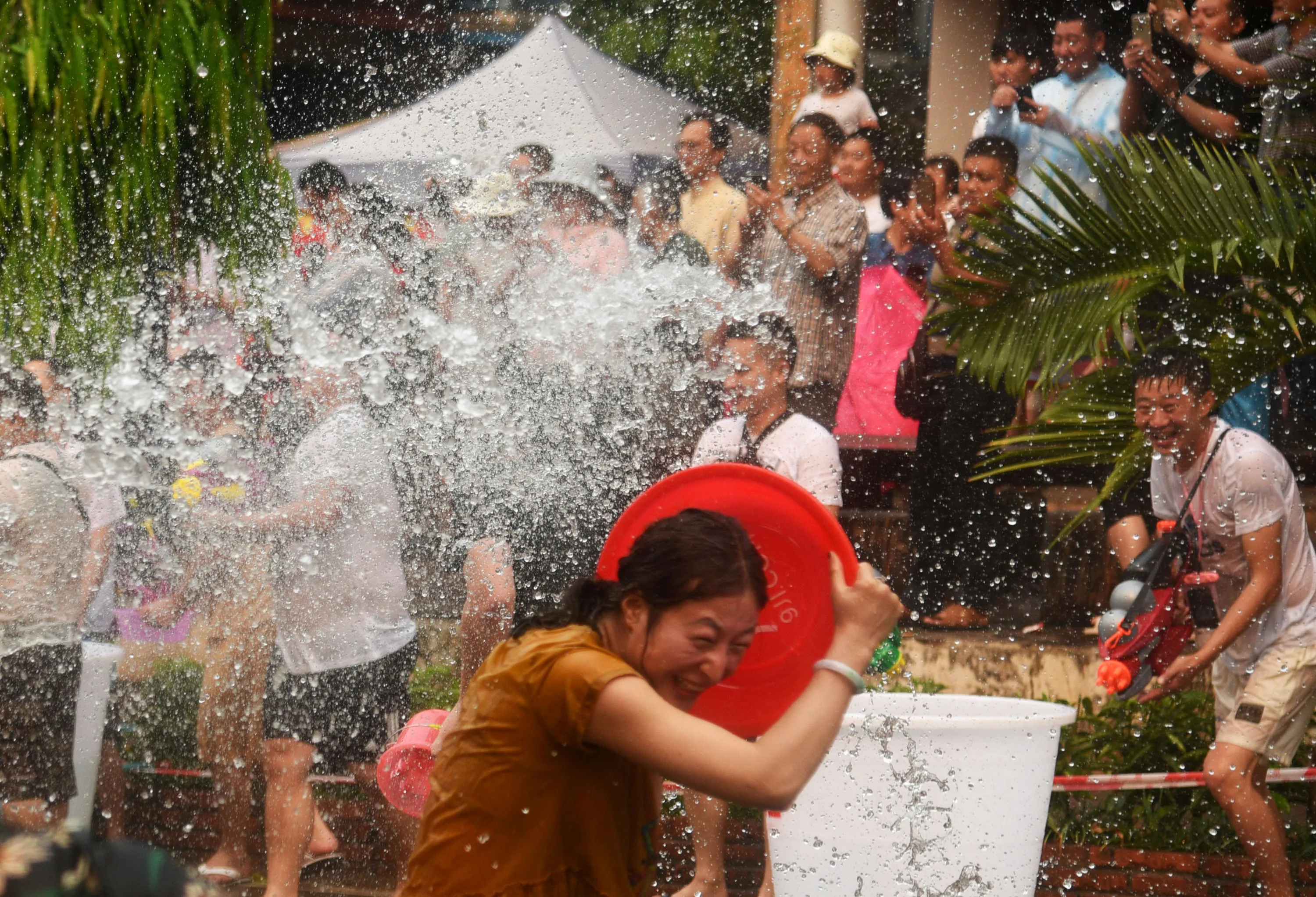 People take part in a Water Splashing festival to mark the New Year of the Dai ethnic group in Xishuangbanna Dai Autonomous Prefecture, Yunnan province, China on April 14, 2019. (Photo by Reuters/China Daily)