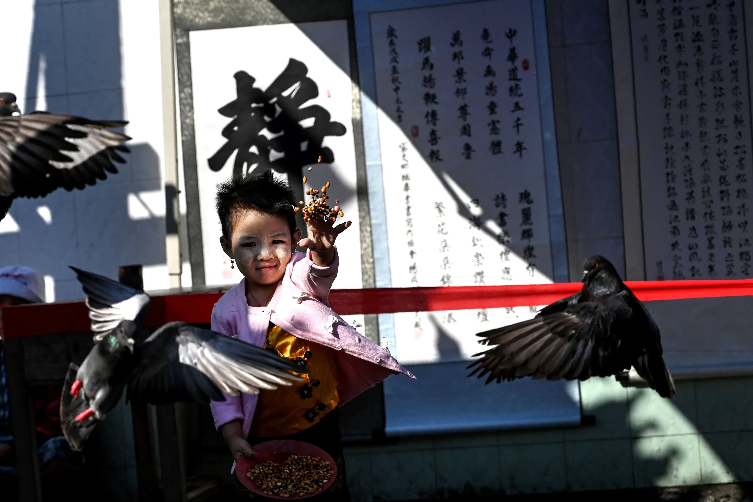 A girl feeds pigeons outside a Chinese temple during Lunar New Year celebrations in Yangon, Myanmar on February 5, 2019. (Photo by Ye Aung Thu/AFP Photo)