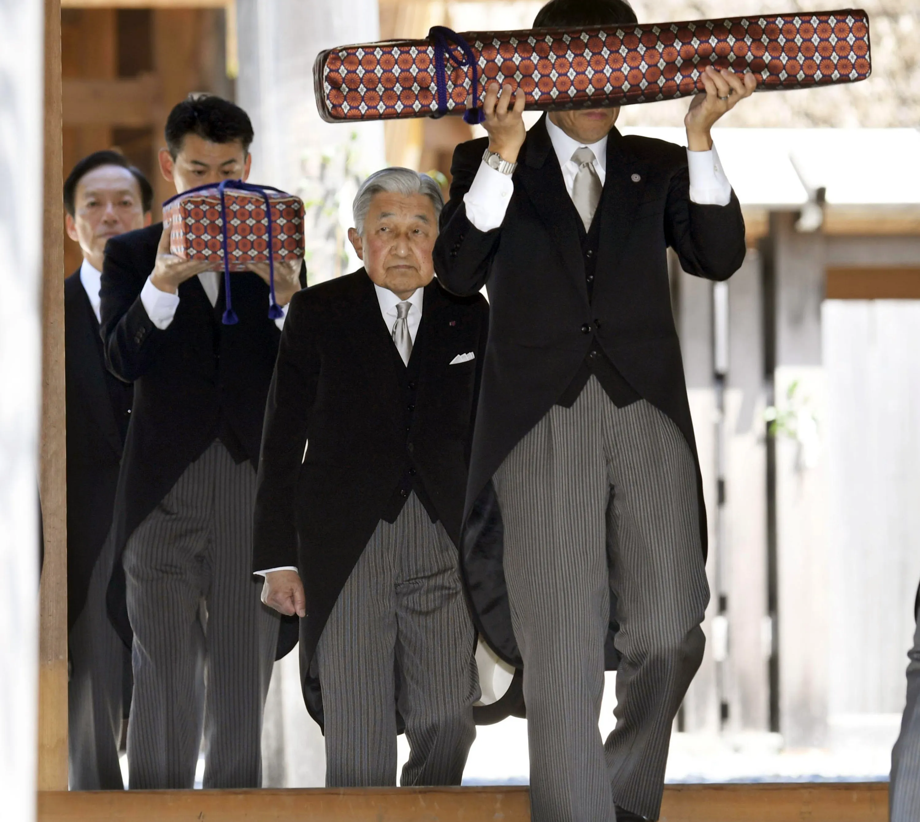 Japanese Emperor Akihito, second right, visits Ise Grand Shrine, or Ise Jingu, in Ise, central Japan Thursday, April 18, 2019. This is the last trip to a local region for emperor and empress before emperor's abdication. (Photo by Kazushi Kurihara/Kyodo News via AP Photo)