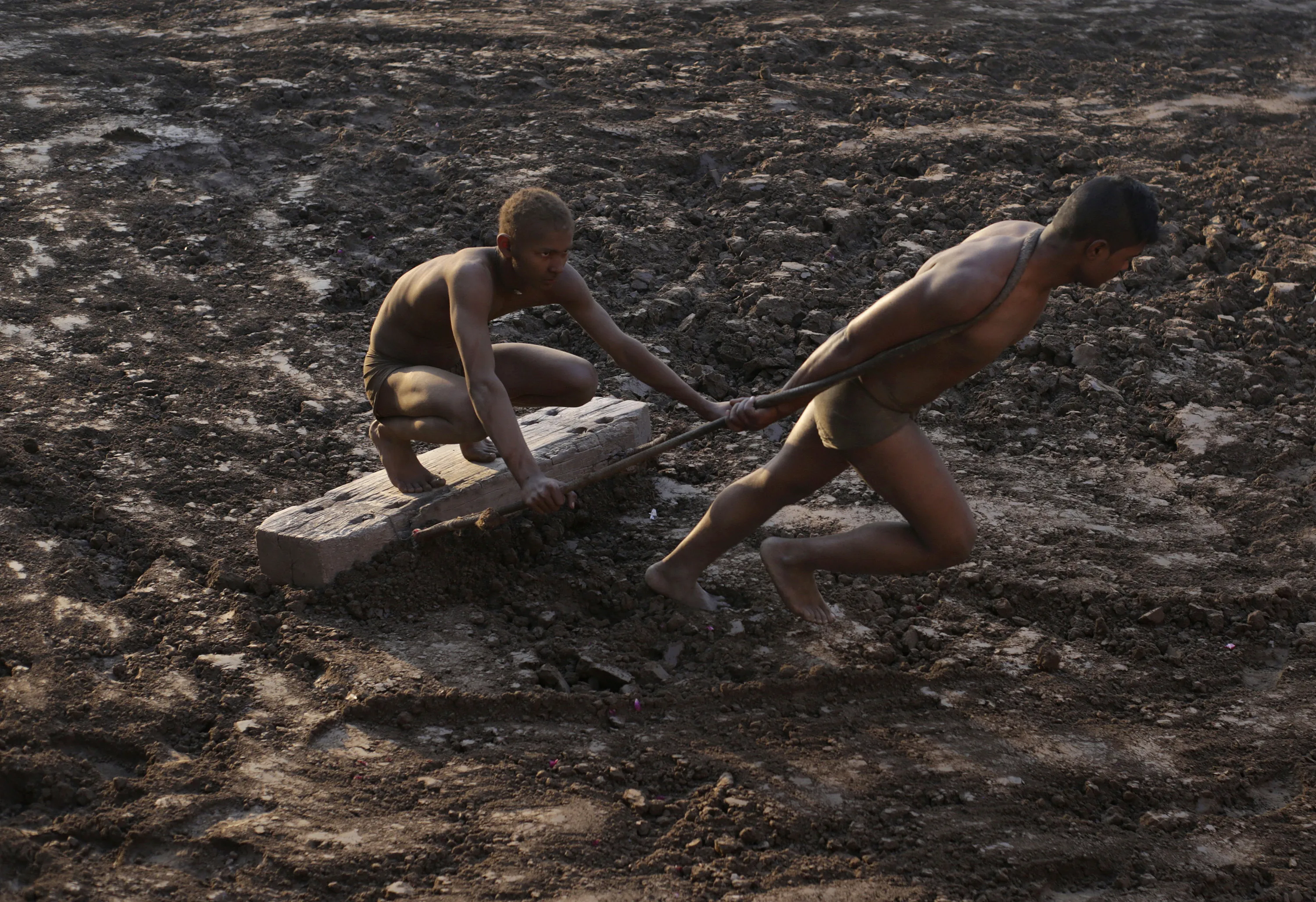 Wrestlers prepare the ground as part of their training for the national sport of Kushti, in Lahore, Pakistan, Monday, January 28, 2019. Kushti, also known as Pehlwani, is a several thousand year-old sport and is practiced in the Indian subcontinent. The wrestlers train and compete on dirt floors, cleared of stones and dyed red. (Photo by K.M. Chaudary/AP Photo)