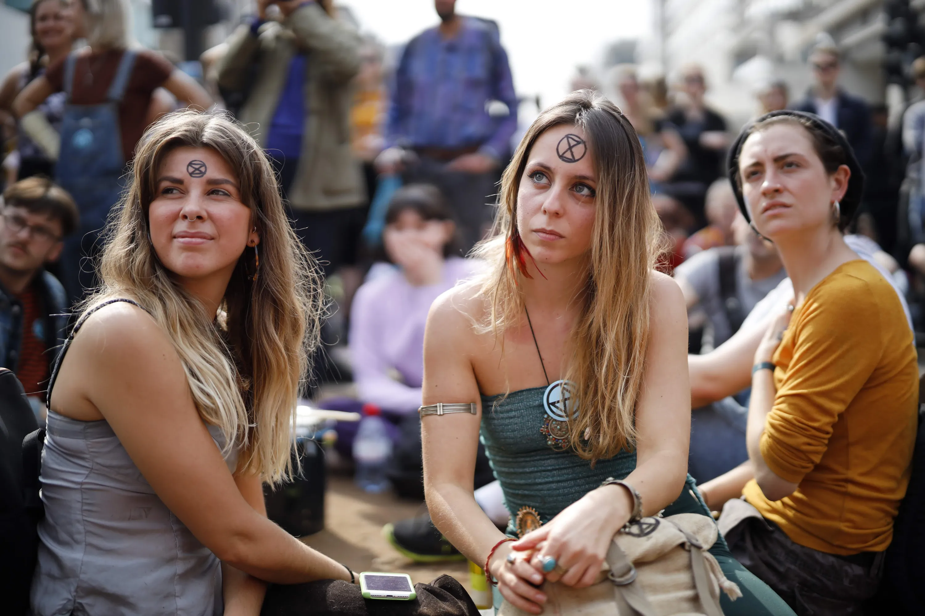 Climate change activists block the road junction at Oxford Circus in central London on April 18, 2019, during the fourth day of an environmental protest by the Extinction Rebellion group. Climate change activists on Thursday brought parts of the British capital to a standstill in a fourth consecutive day of demonstrations that have so far led to more than 400 arrests. (Photo by Tolga Akmen/AFP Photo)