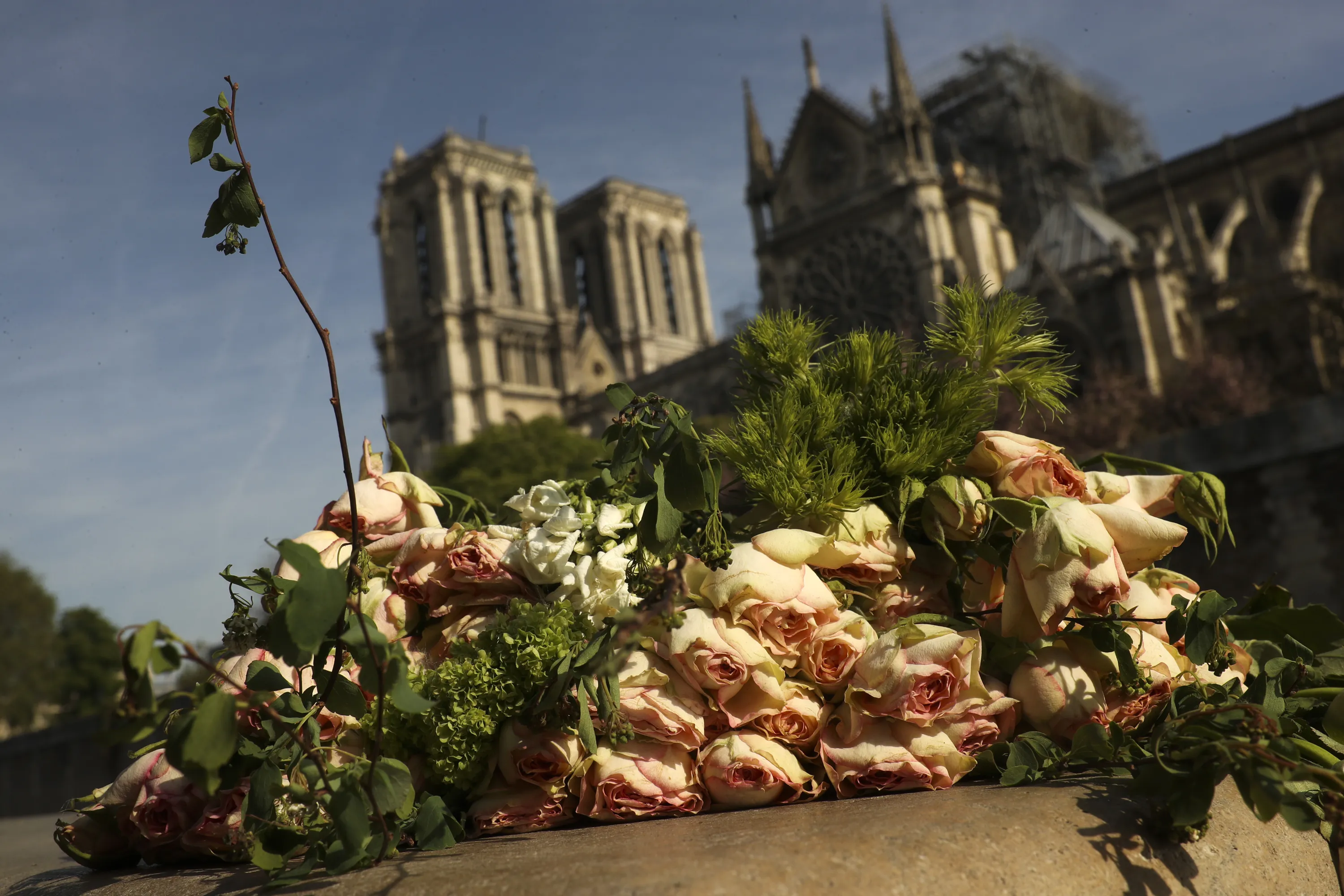 A bunch of flowers lies by the Seine riverside near the Notre Dame cathedral, background, in Paris, Thursday, April 18, 2019. France is paying a daylong tribute Thursday to the Paris firefighters who saved the internationally revered Notre Dame Cathedral from collapse and rescued its treasures from encroaching flames. (Photo by Francisco Seco/AP Photo)