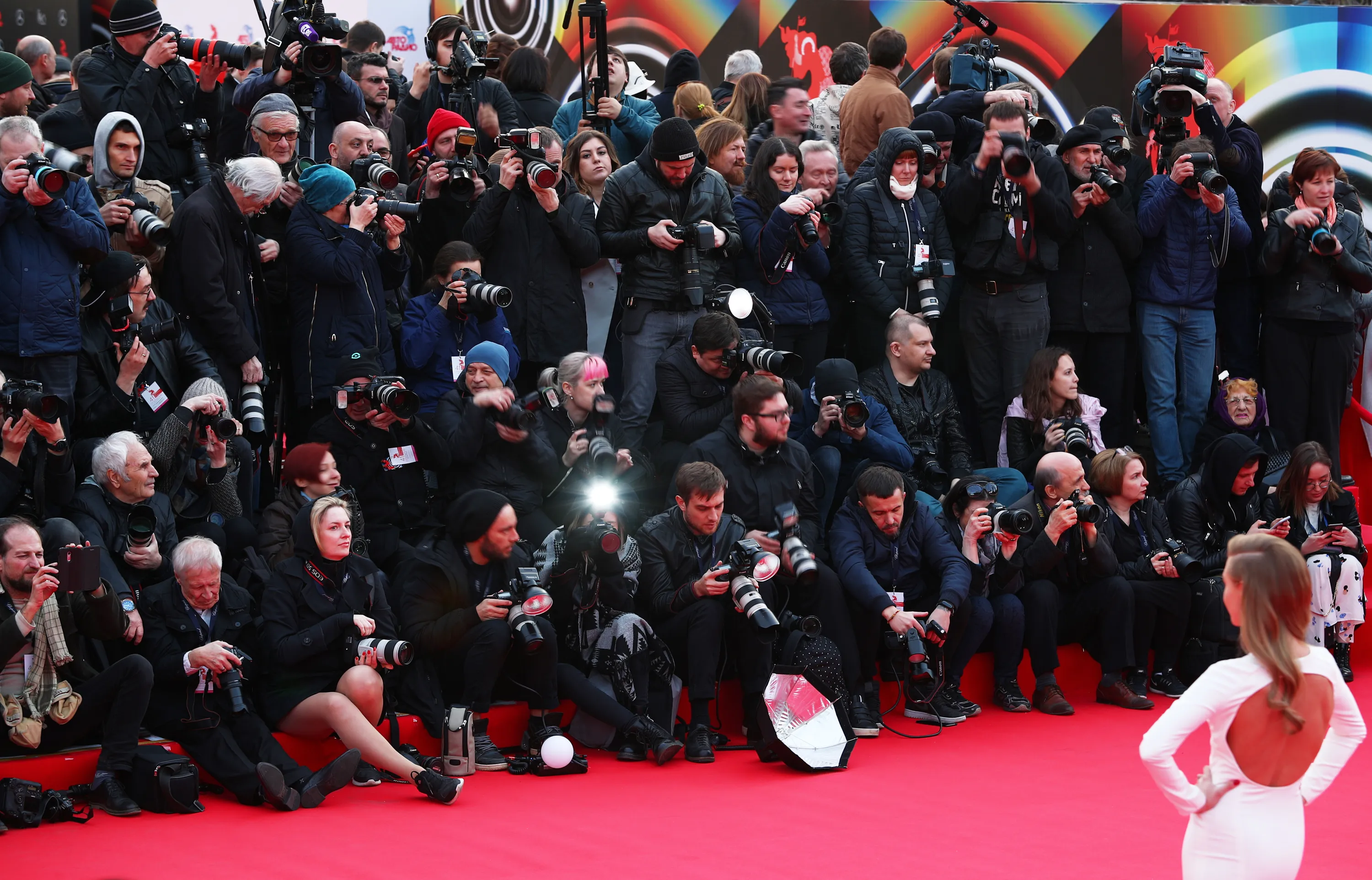 Journalists and photographers attend a ceremony to open the 2019 Moscow International Film Festival at the Rossiya Theatre in Moscow, Russia on April 18, 2019. (Photo by Mikhail Tereshchenko/TASS)