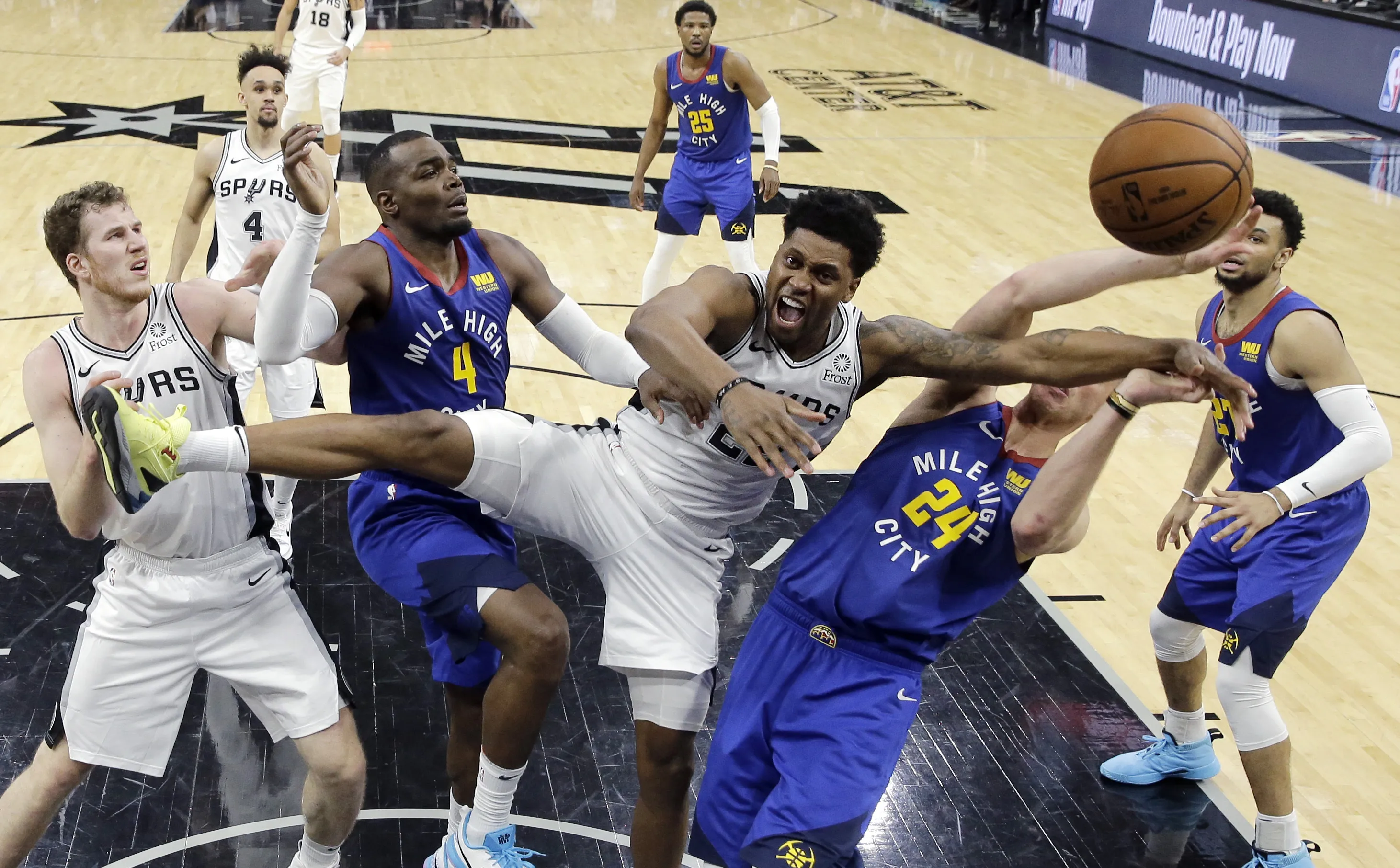 San Antonio Spurs forward Rudy Gay (22) is fouled as he drives to the basket against Denver Nuggets forward Mason Plumlee (24) and forward Paul Millsap (4) during the second half of Game 3 of an NBA basketball playoff series in San Antonio, Thursday, April 18, 2019. San Antonio won 118-108. (Photo by Eric Gay/AP Photo)