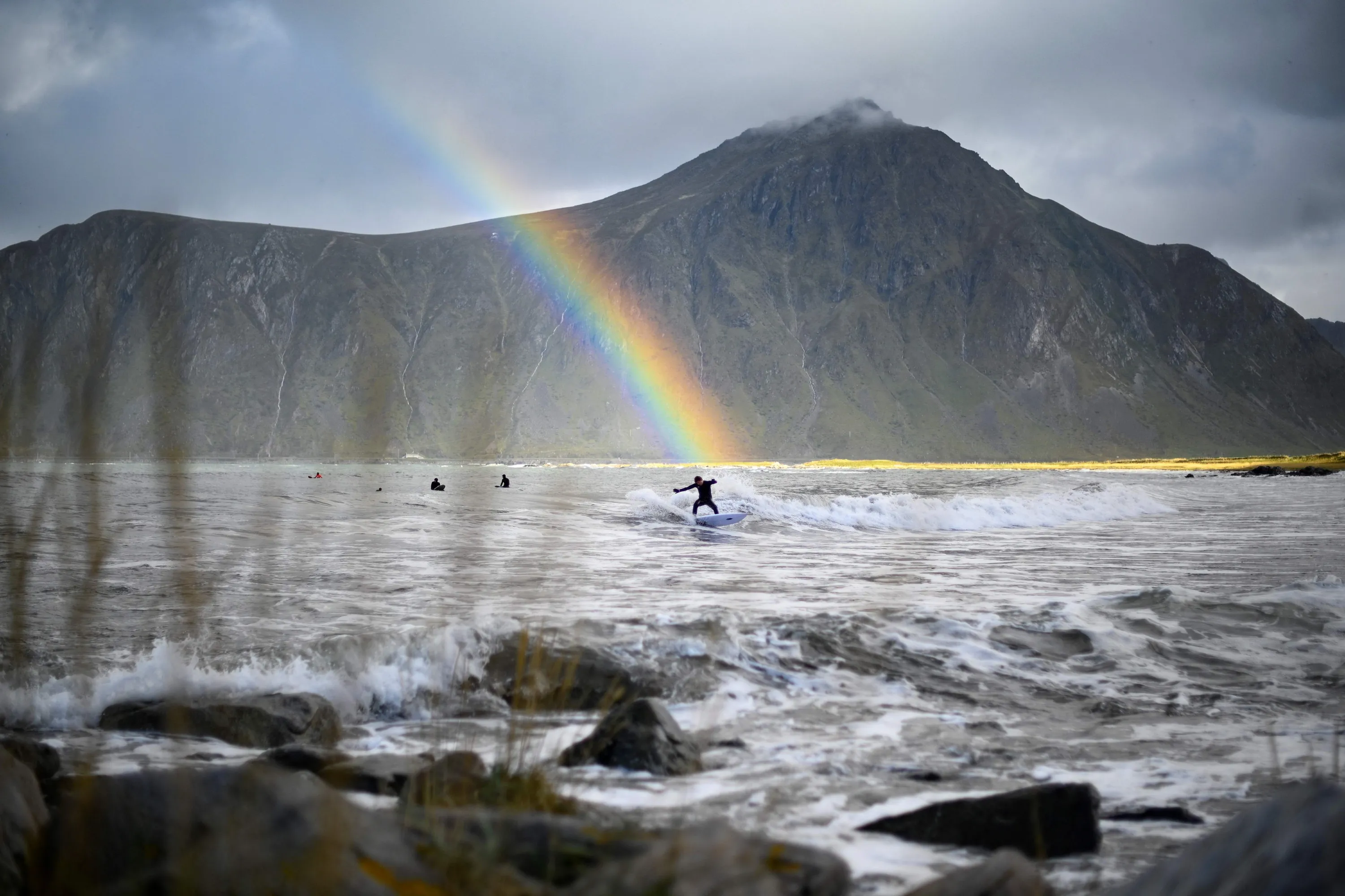 Surfer Anker Olsen Frantzen, 17, of Norway, rides a wave under a rainbow during a free surf session on September 26, 2018, in Flakstad, northern Norway, at the eve of the Lofoten Masters 2018. Lofoten Masters 2018, the most northern Surf contest, will be held from September 27 to 30, in Unstad, within Arctic circle. (Photo by Olivier Morin/AFP Photo)