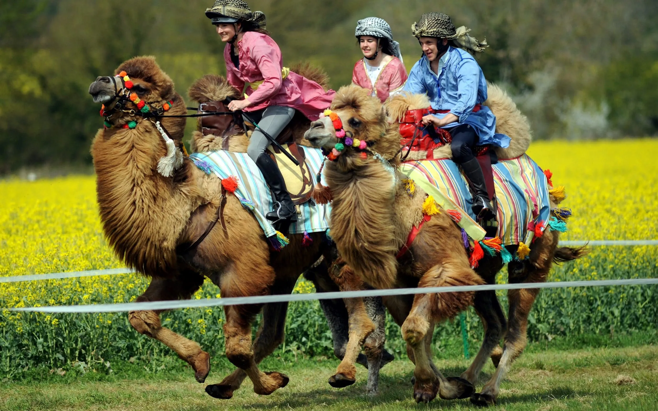 Camel racing made its debut in Paxford, Gloucestershire, England yesterday at a point-to-point event on April 22, 2019. Each of the four camels was sponsored by a local pub. (Photo by Paul Nicholls/The Times)
