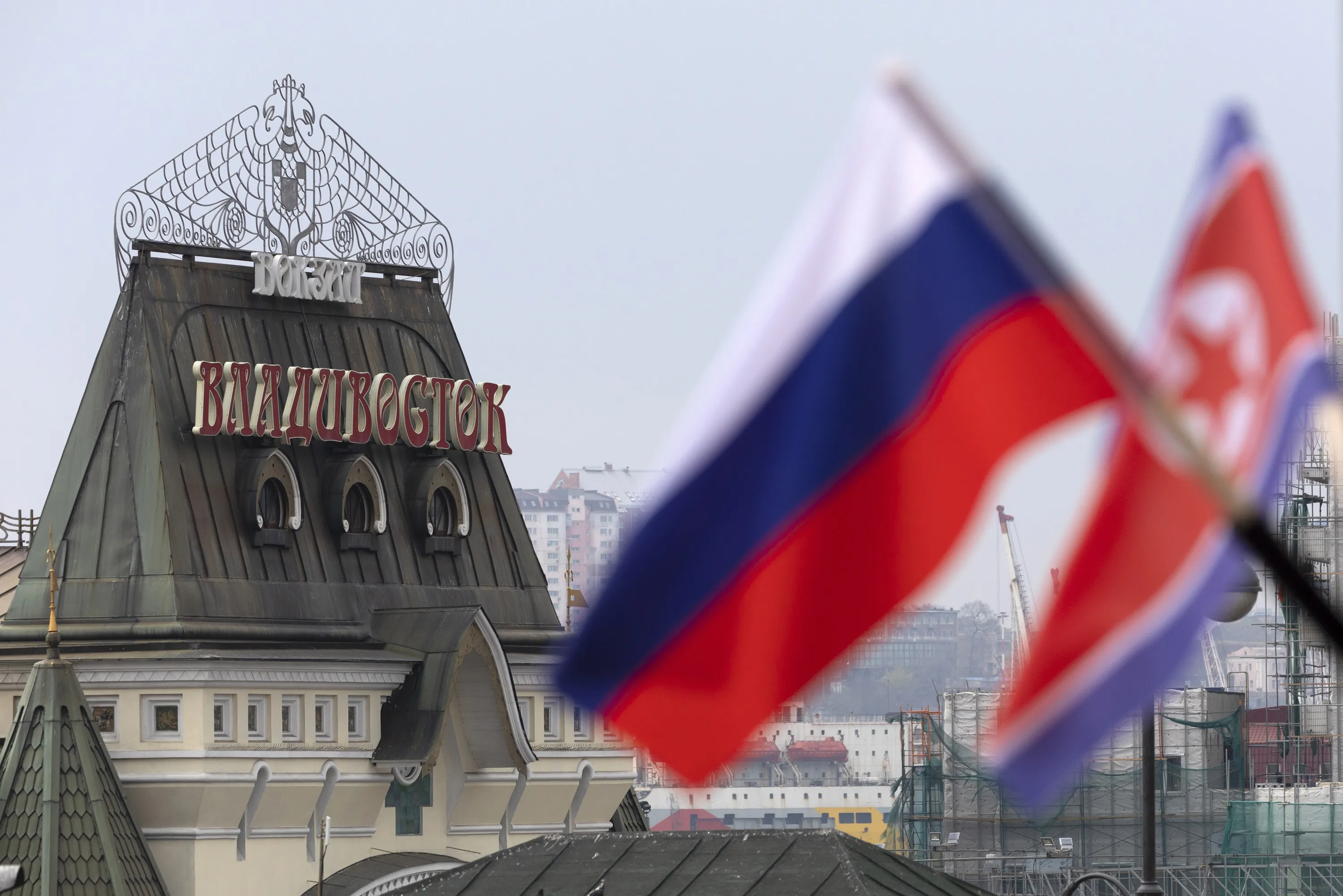 Flags of Russia and North Korea are seen in front of the central railway station in Vladivostok, Russia, Wednesday, April 24, 2019. North Korean leader Kim Jong Un arrived in Russia on Wednesday morning for his much-anticipated summit with Russian President Vladimir Putin in the Pacific port city of Vladivostok. (Photo by Alexander Khitrov/AP Photo)