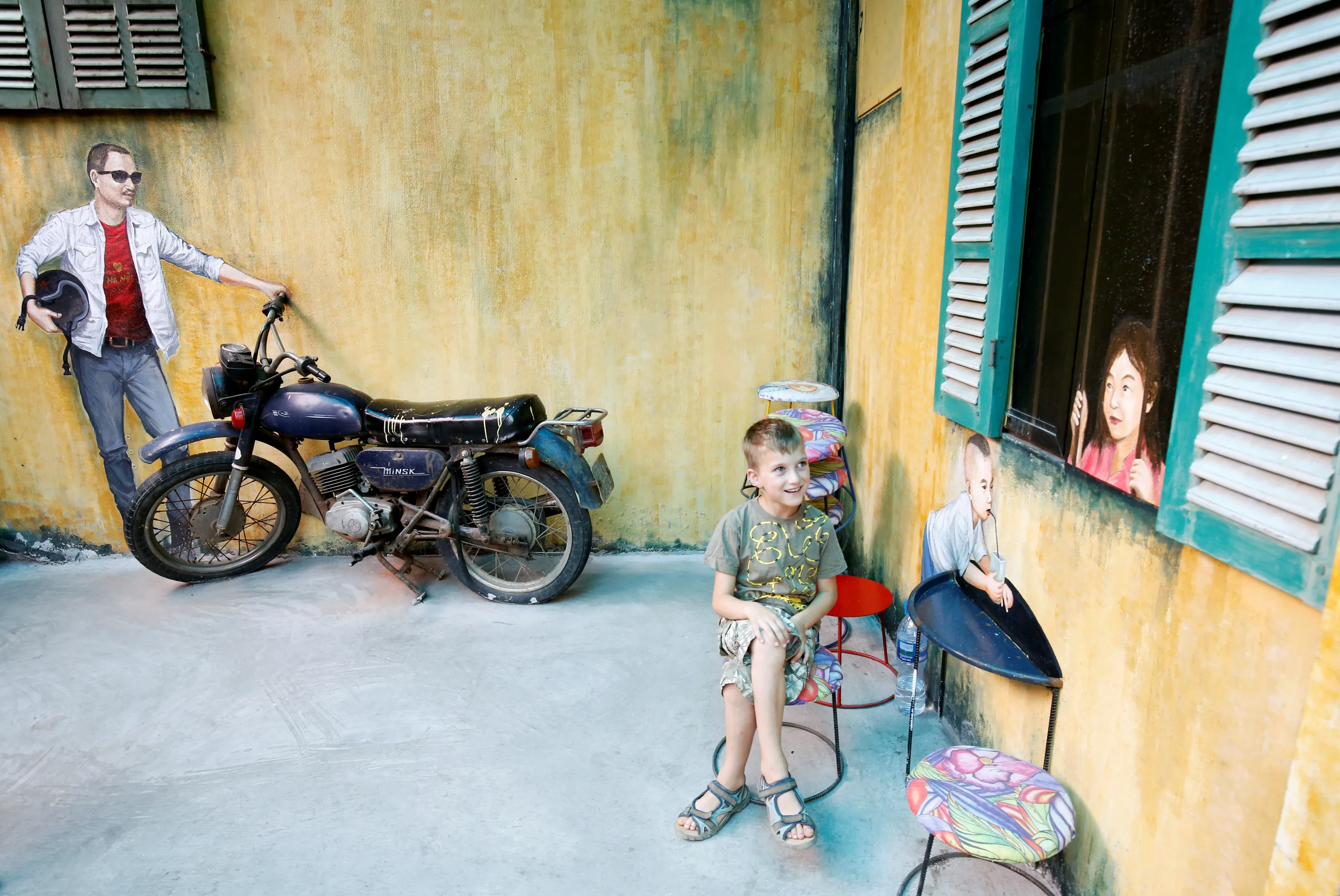 A boy sits near the Soviet-era Minsk motorcycle at a repurposed cafe named Hidden Gem Cafe which contains recyclable objects in Hanoi, Vietnam on March 12, 2019. (Photo by Reuters/Kham)
