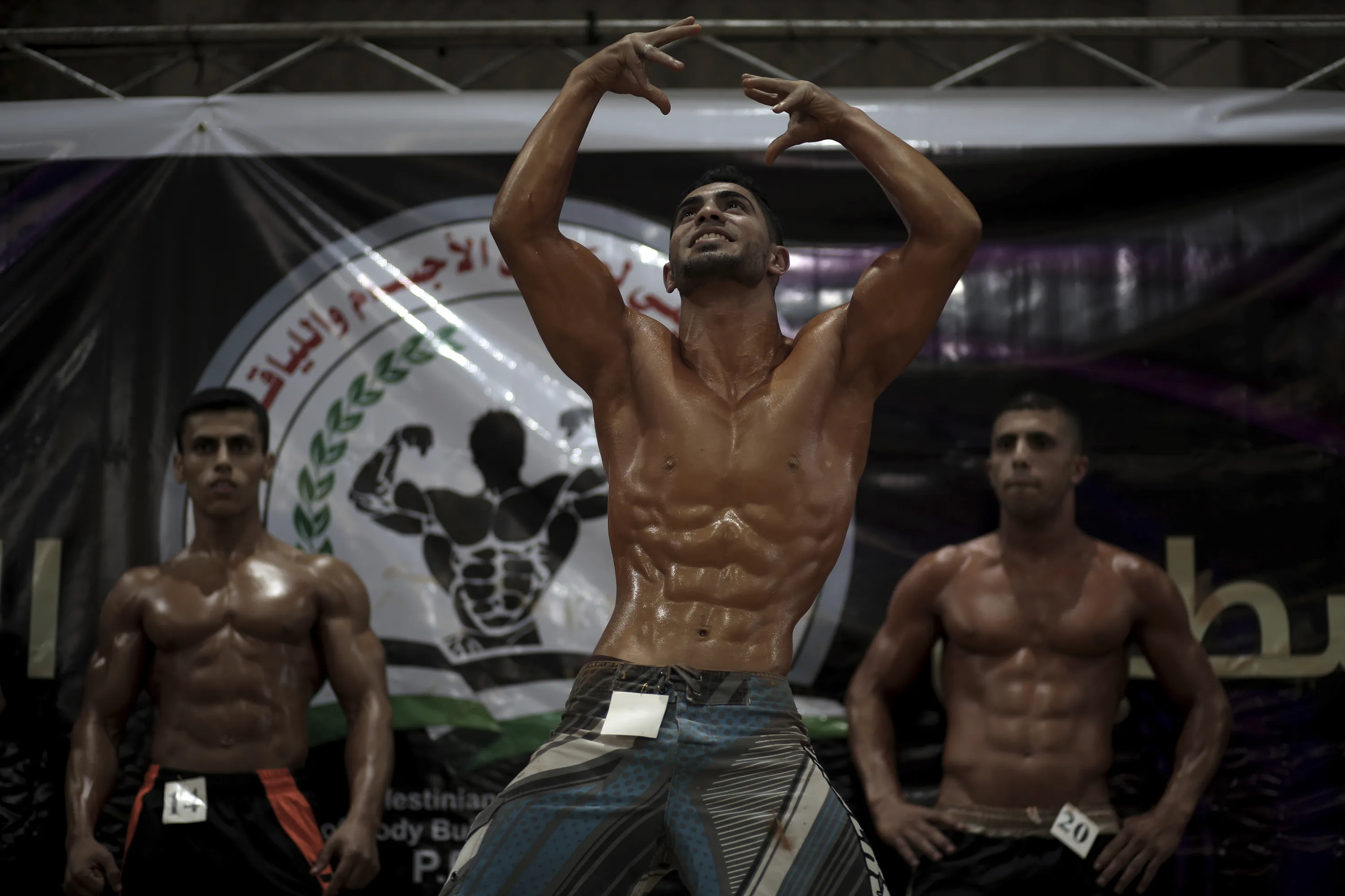 In this Friday, October 26, 2018 photo, Palestinian contestants, including Abdallah al-Hour, 20, center, perform on stage during a local bodybuilding competition, in Gaza City. In the end, al-Hour, 20, was crowned the winner in his weight category, in front of his home crowd and hoisted on the shoulders of his supporters in the packed, all-male gymnasium. (Photo by Khalil Hamra/AP Photo)