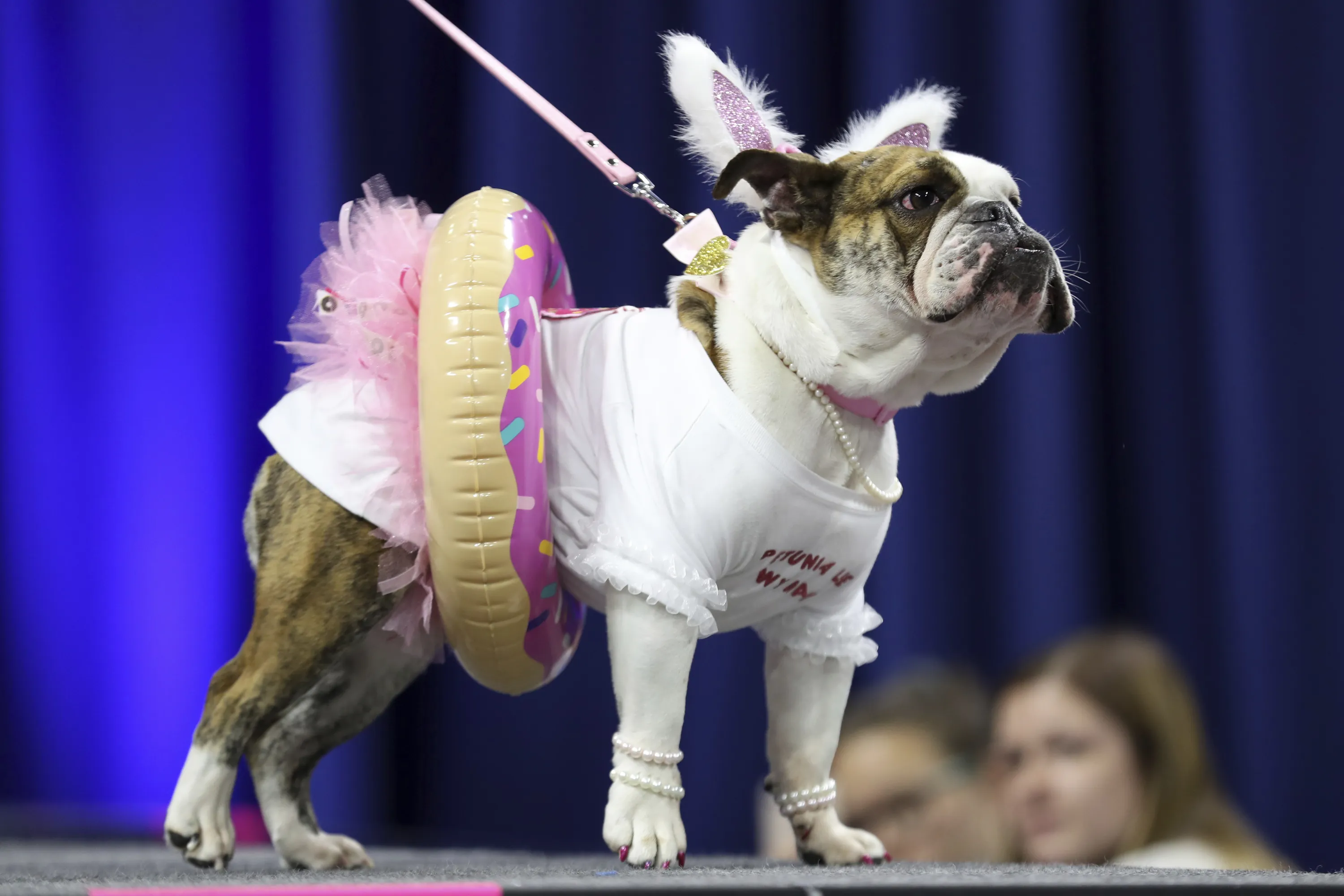 Petunia, owned by Leah Wyman, of Spencer, Iowa, stands on stage during the 40th annual Drake Relays Beautiful Bulldog Contest, Monday, April 22, 2019, in Des Moines, Iowa. The pageant kicks off the Drake Relays festivities at Drake University where a bulldog is the mascot. (Photo by Charlie Neibergall/AP Photo)