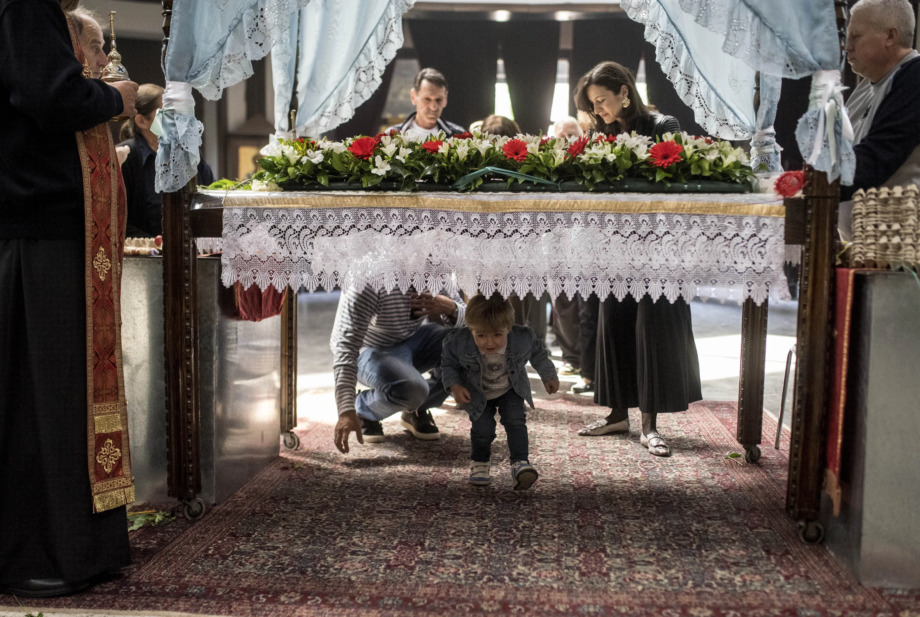 An Orhtodox priest blesses a child passing under a table which symbolizes the grave of Jesus Christ during the Good Friday processions at the main Orthodox church St Kliment in Skopje on April 26, 2019. North Macedonian Orthodox Church celebrates Easter, according to the Julian calendar. (Photo by Robert Atanasovski/AFP Photo)