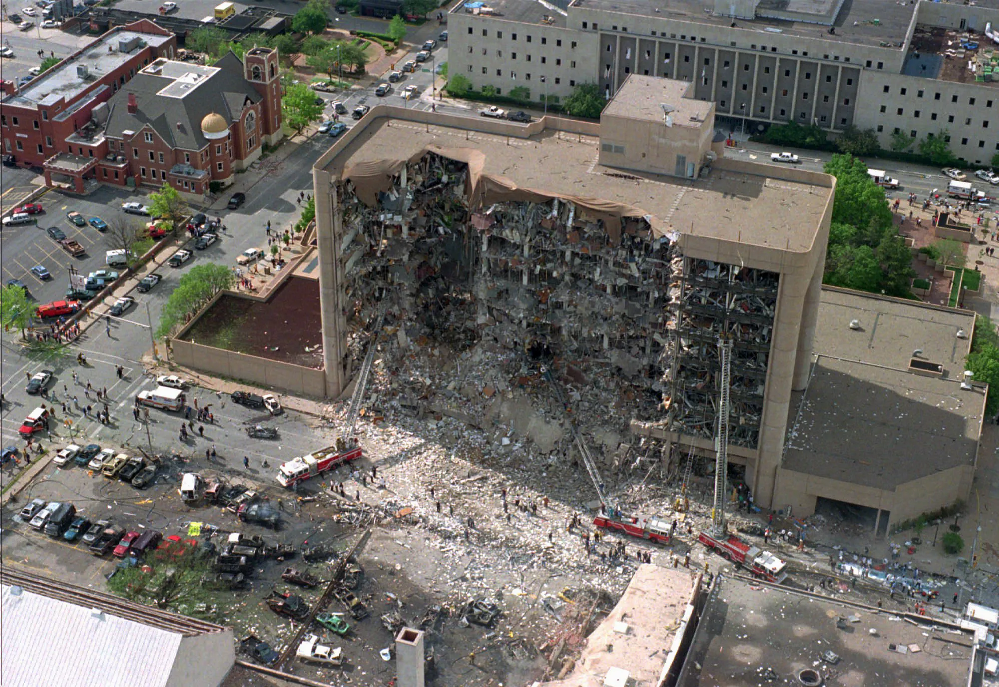 In this April 19, 1995, aerial file photo, the north side of the Alfred P. Murrah Federal Building in Oklahoma City is pictured after an explosion that killed 168 people and injured hundreds. As part of the city's annual day of remembrance Friday, April 19, 2019, – the 24th anniversary of the attack – civic leaders will plant a tree that was cloned from the Survivor Tree – a scarred American elm that survived the deadliest act of domestic terrorism on U.S. soil. (Photo by AP Photo/File)