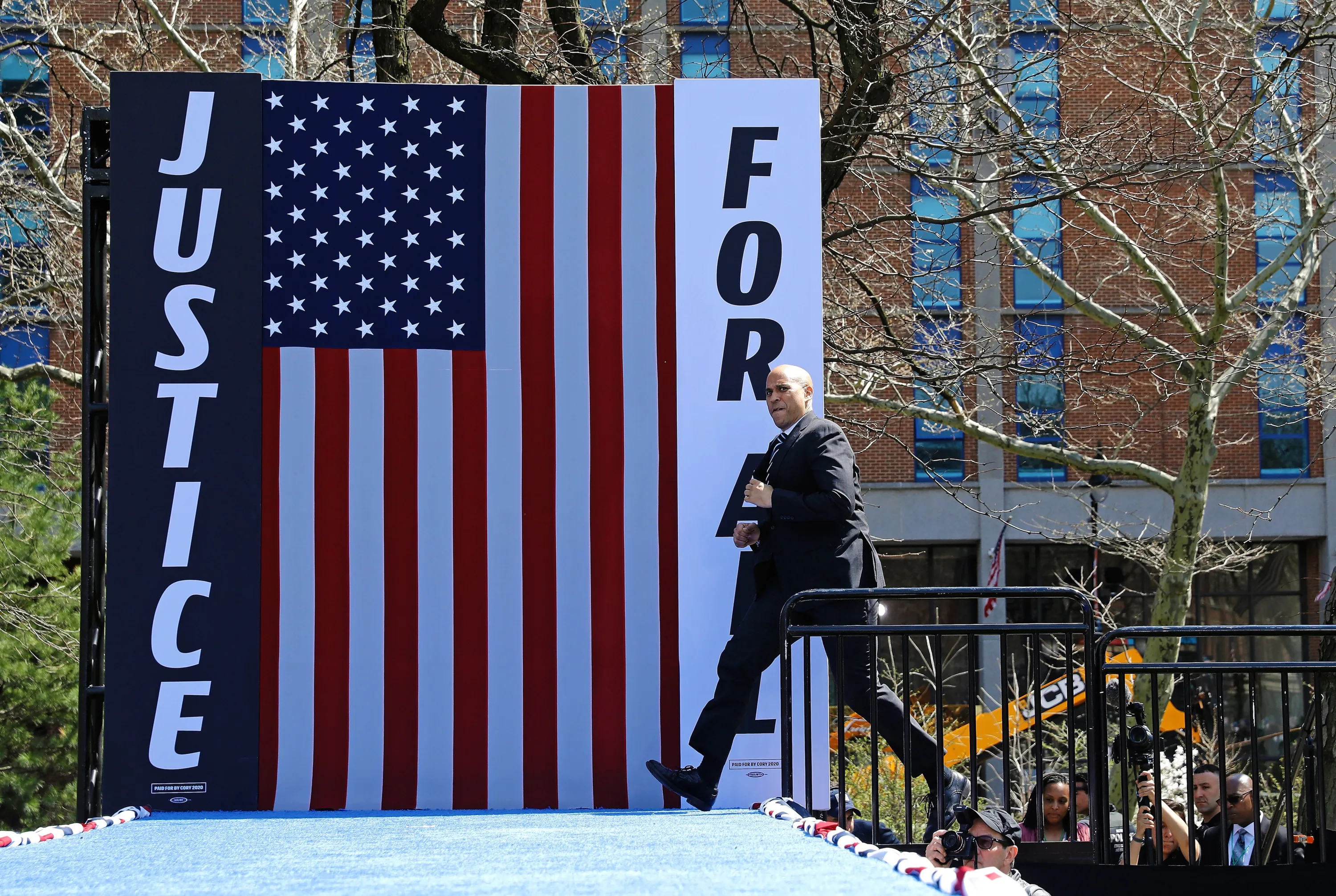 US Senator from New Jersey Cory Booker and democratic presidential candidate takes the stage at his official hometown campaign kickoff in Newark, New Jersey, USA, 13 April 2019. Booker is one of six US Senators running for the democratic nomination for US president. (Photo by Peter Foley/EPA/EFE)