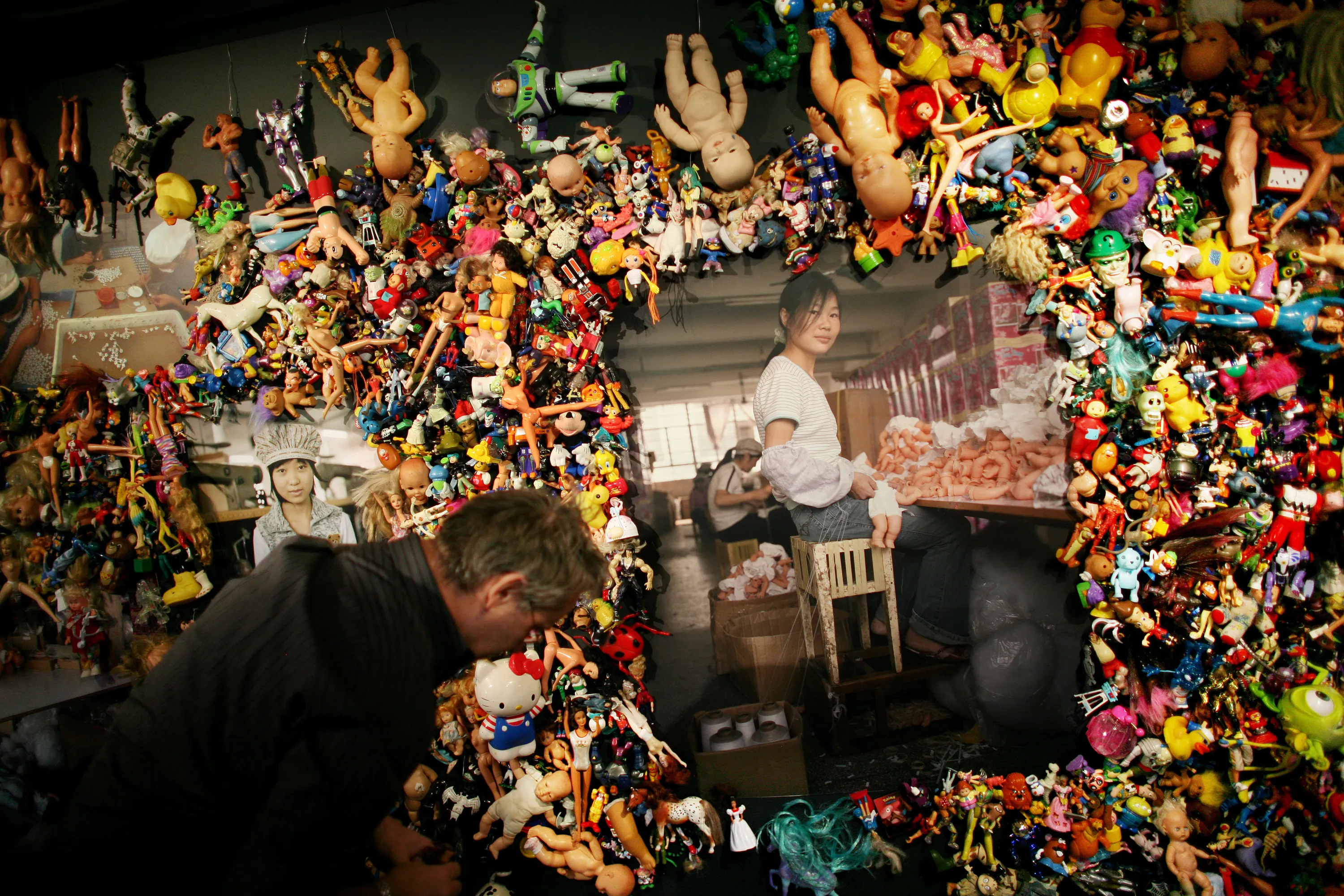 Finishing touches are made to The Real Toy Story by Michael Wolf (pictured), an installation of plastic toys, dolls and photography as part of the China Design Now exhibition in Liberty, London. (Photo by Graeme Robertson/The Guardian)