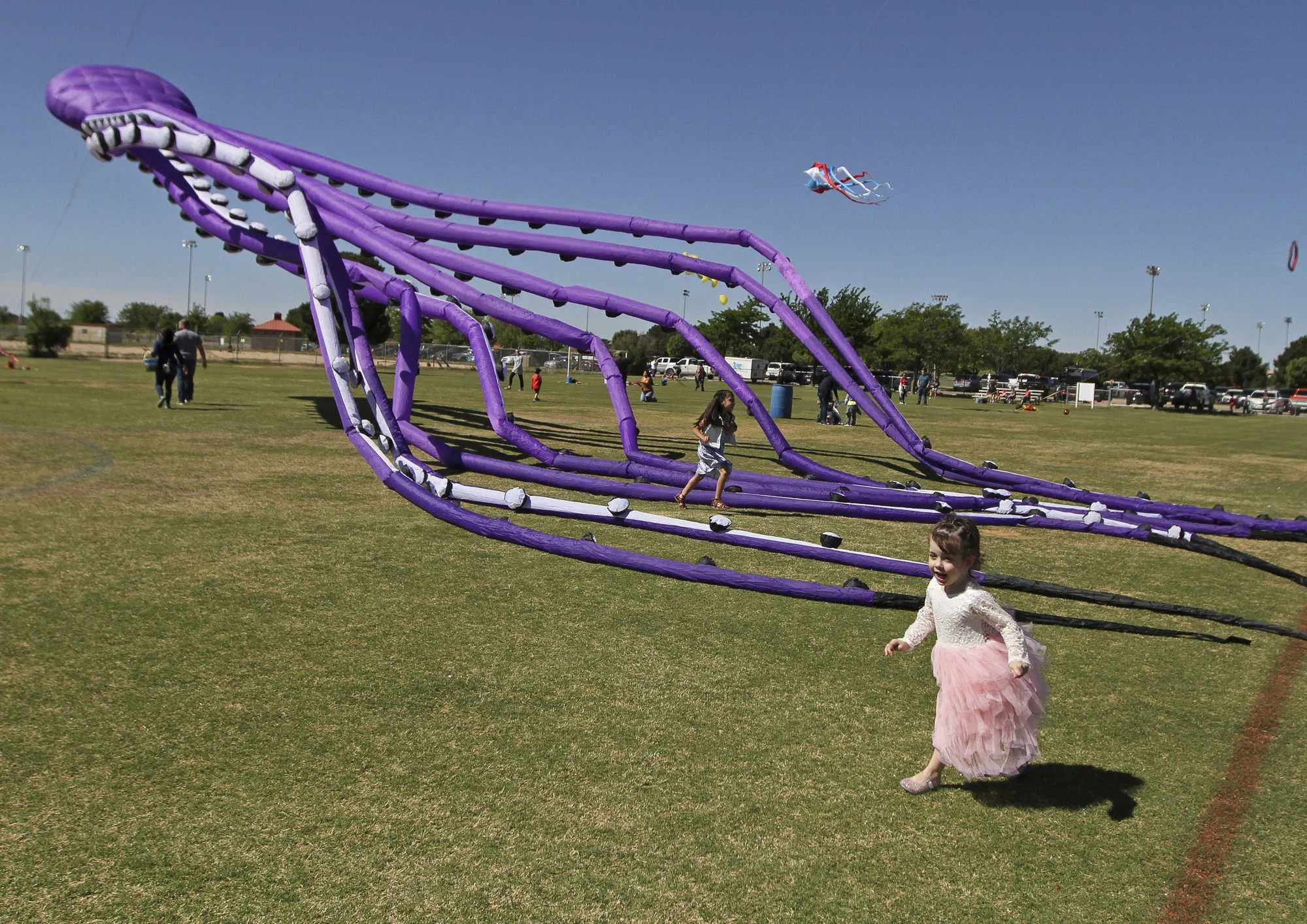 Tazzara Barba, 2, runs from an octopus kite after the Community Easter Egg Hunt at the annual City of Odessa Parks & Recreation's Easter Spring Fling at UTPB Park Saturday, April 20, 2019, in Odessa, Texas. Activities included the Bunny Hop 5K Fun Run, a Community Easter Egg Hunt and a Kite Festival. There was also crafts, games, food, visits with Peter Cottontail and more. (Photo by Jacob Ford/Odessa American via AP Photo)