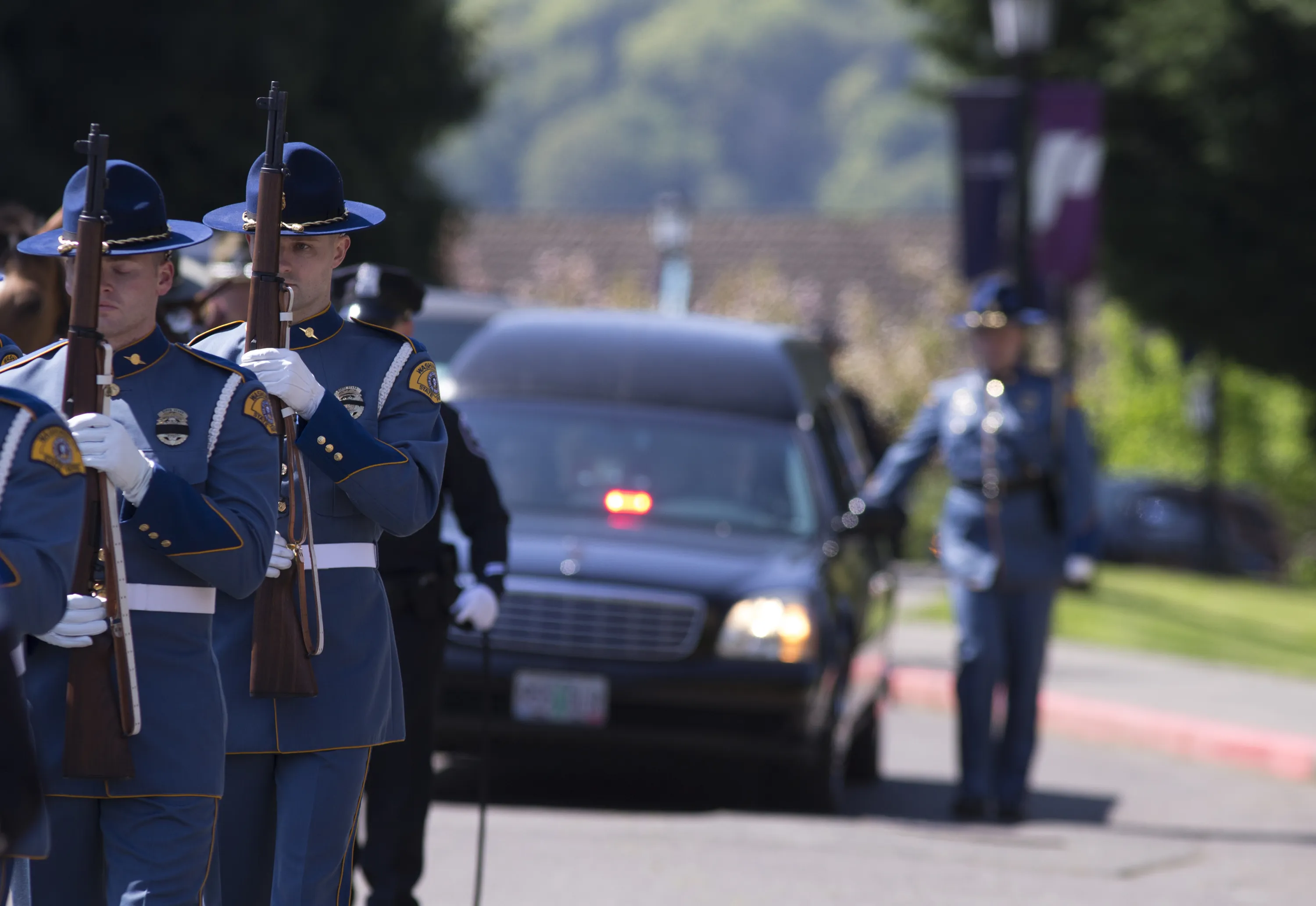 A procession honoring Cowlitz County Deputy Justin DeRosier makes its way to the Chiles Center at the University of Portland, where a memorial service is taking place for the slain deputy, Wednesday, April 24, 2019 in Portland, Ore. (Photo by Beth Nakamura/The Oregonian via AP Photo)