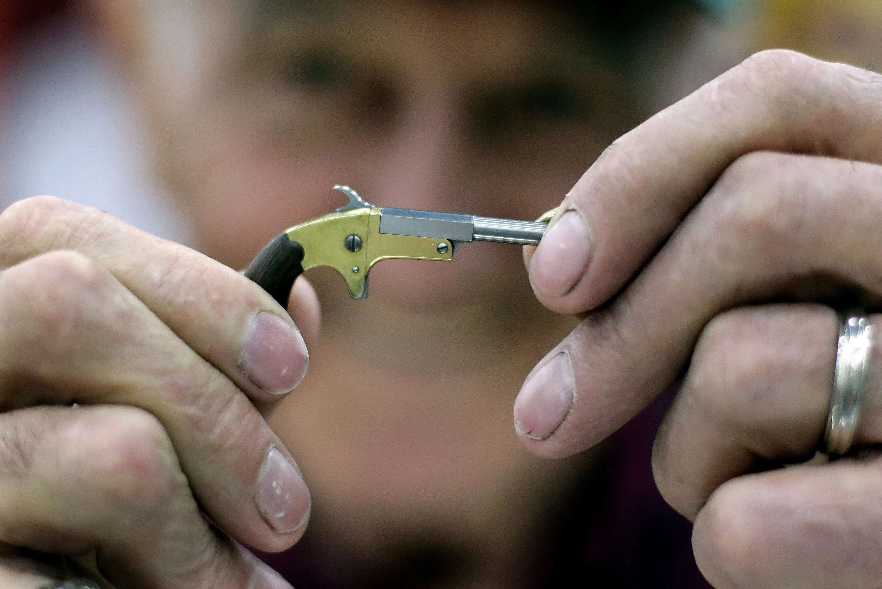 In this, May 21, 2016, file photo, Bob McGinnis, of Cross Plains, Wis., holds a miniature gun he has made at a display of the Miniature Arms Society at the National Rifle Association convention in Louisville, Ky. The convention, that started in 1871 as a group devoted to hunting, shooting sports and gun safety, has evolved into one of the most powerful forces in American politics. (Photo by Mark Humphrey/AP Photo/File)