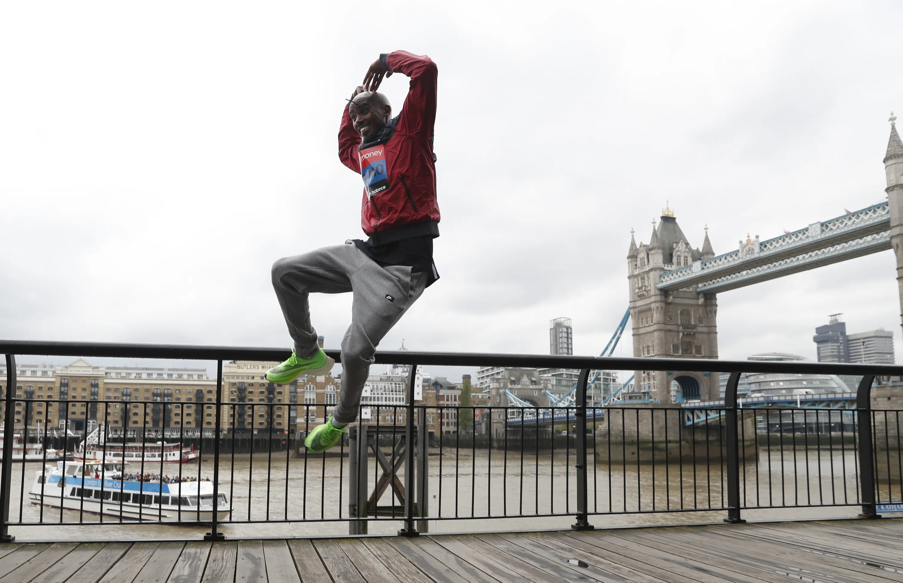 Britain's Mo Farah leaps as he poses for the media during a photo call for the London Marathon in London, Wednesday, April 24, 2019. Farah will take part in the 39th London Marathon which takes place Sunday April 28. (Photo by Alastair Grant/AP Photo)