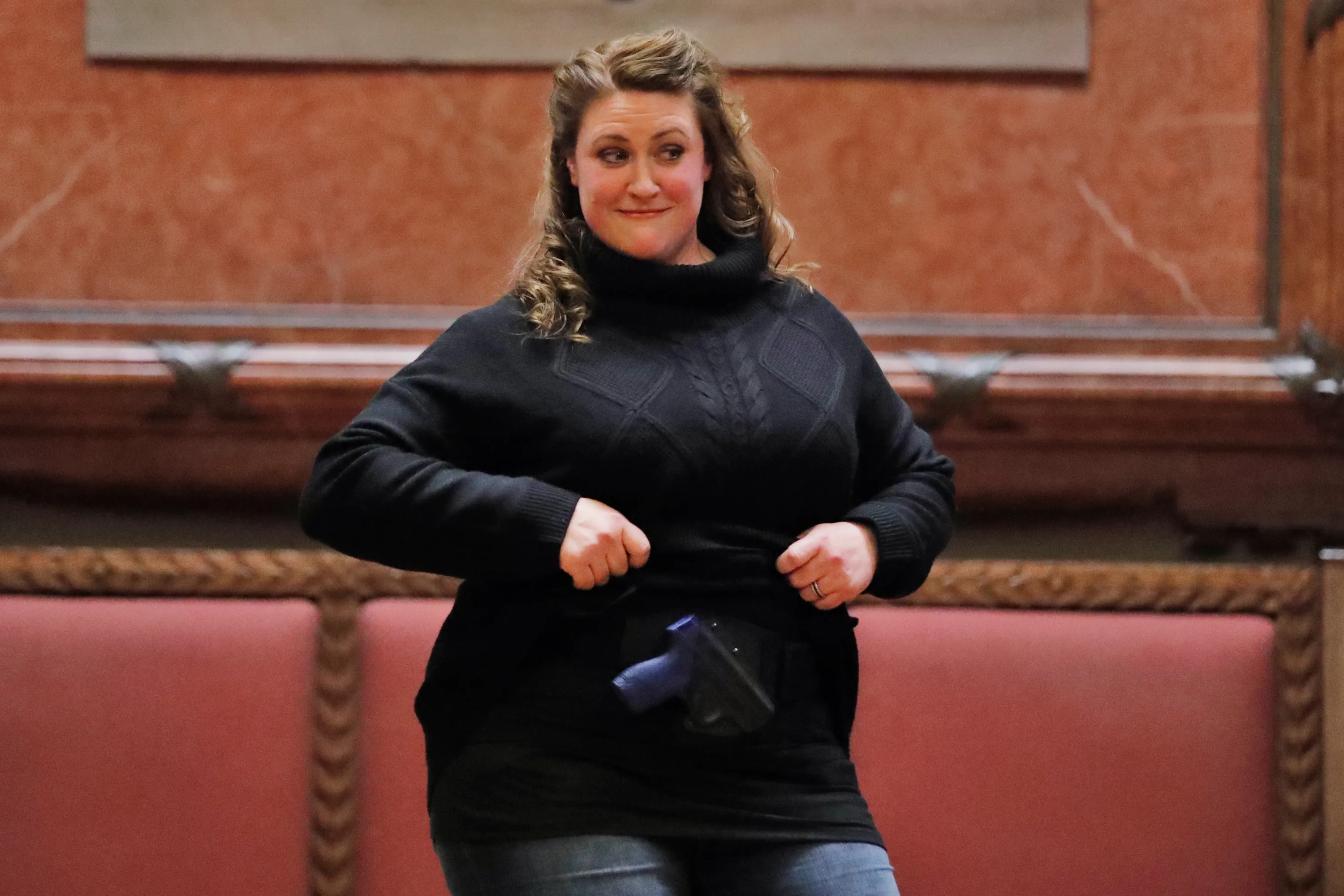 A woman models the Tactica Concealed Carry Knit Sweater during the “Fashion & Firearms” concealed carry fashion show at the National Rifle Association (NRA) annual meeting in Indianapolis, Indiana, U.S., April 27, 2019. (Photo by Lucas Jackson/Reuters)
