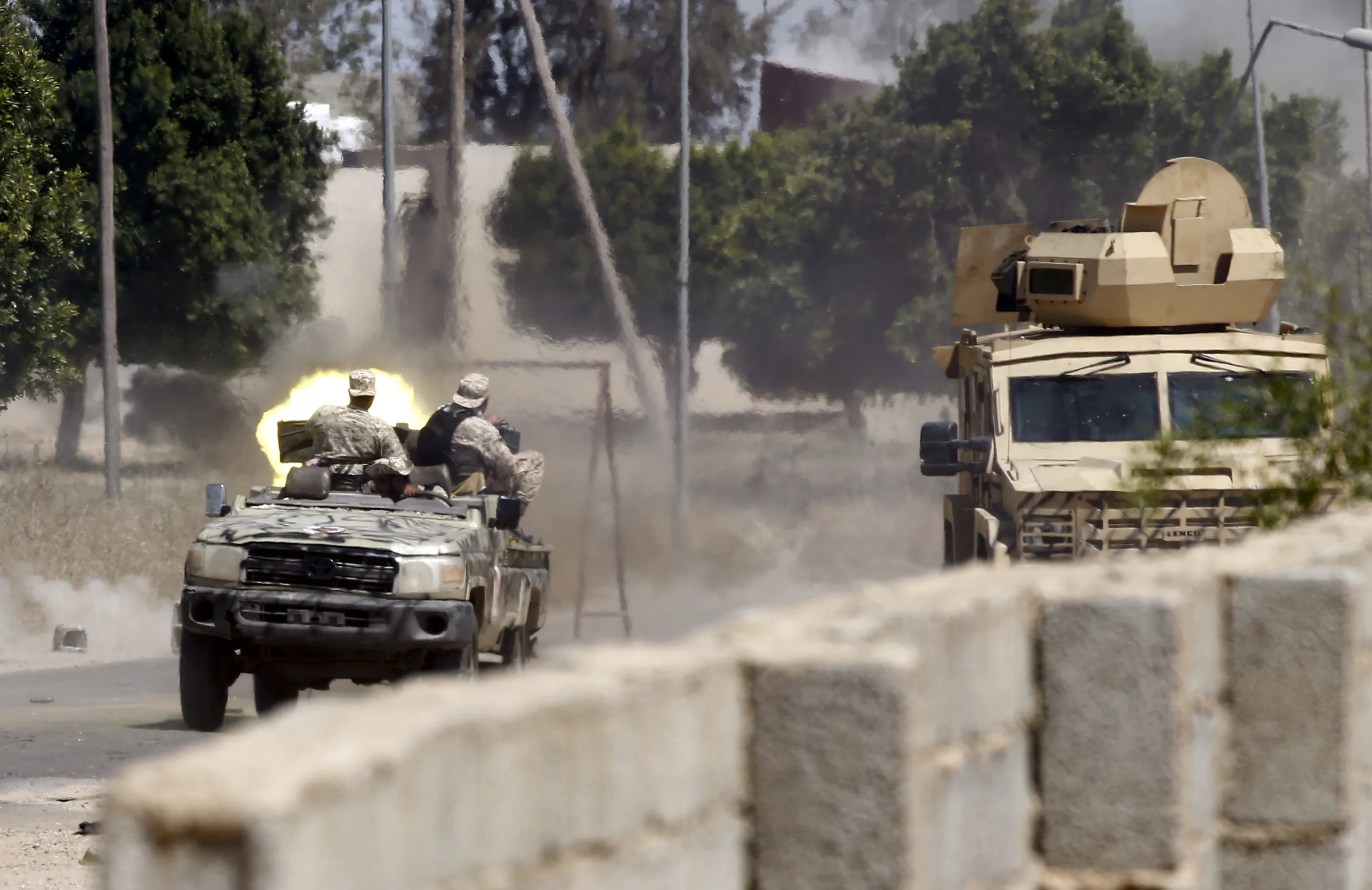 Fighters loyal to the internationally-recognised Government of National Accord (GNA) fire a jeep-mounted gun during clashes with forces loyal to strongman Khalifa Haftar, in Espiaa, about 40 kilometres (25 miles) south of the Libyan capital Tripoli on April 29, 2019. Fierce fighting for control of Libya's capital that has already displaced tens of thousands of people threatens to bring a further worsening of humanitarian conditions, a senior UN official has warned. (Photo by Mahmud Turkia/AFP Photo)