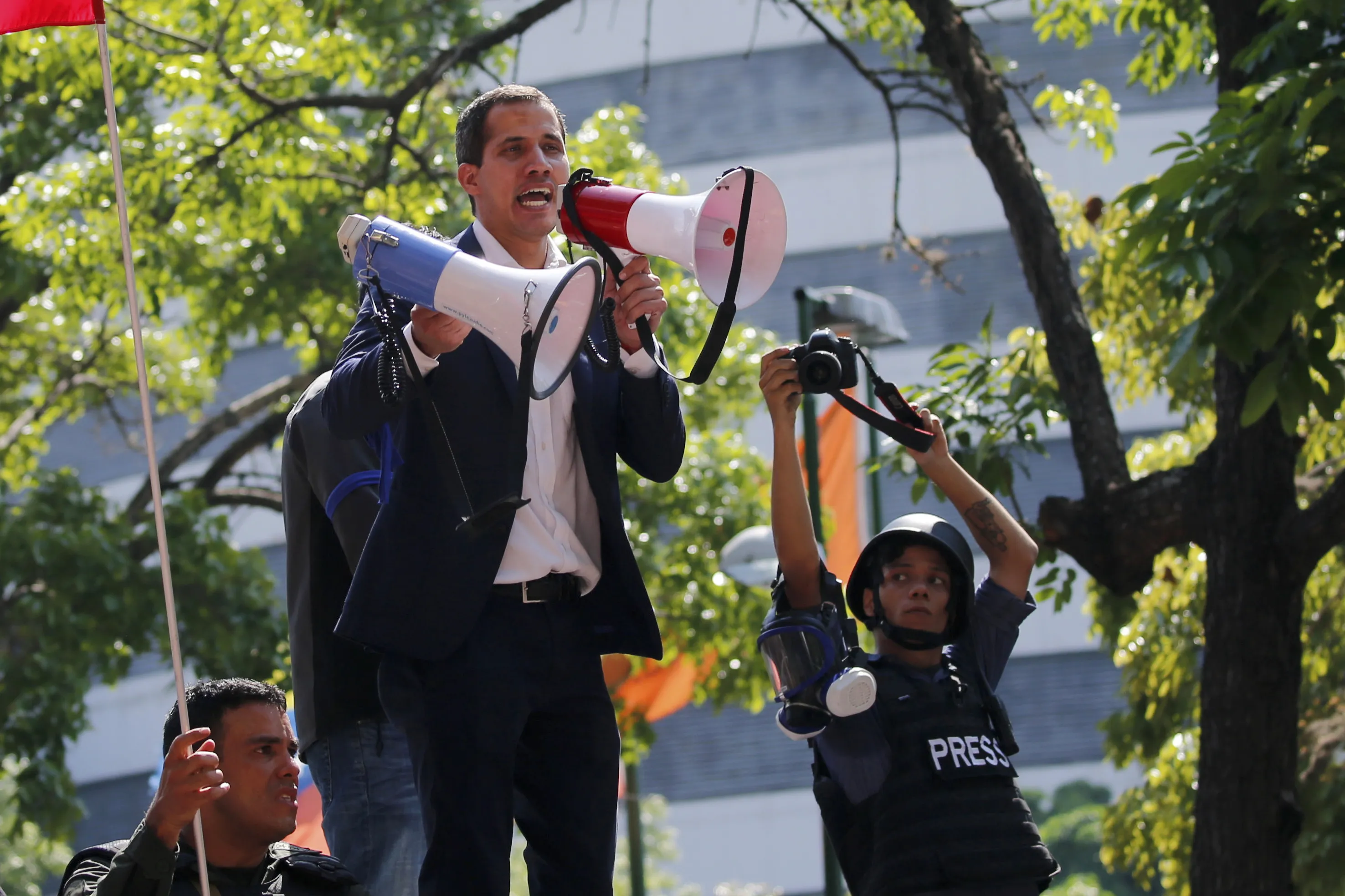 Venezuela's self-proclaimed president Juan Guaido speaks to supporters as he calls for the military to rise up and oust President Nicolas Maduro in Altamira Plaza in Caracas, Venezuela, Tuesday, April 30, 2019. Guaido and jailed opposition leader Leopoldo Lopez took to the streets with a small contingent of heavily armed troops early Tuesday in a bold and risky call for the military to rise up and oust Maduro. (Photo by Fernando Llano/AP Photo)