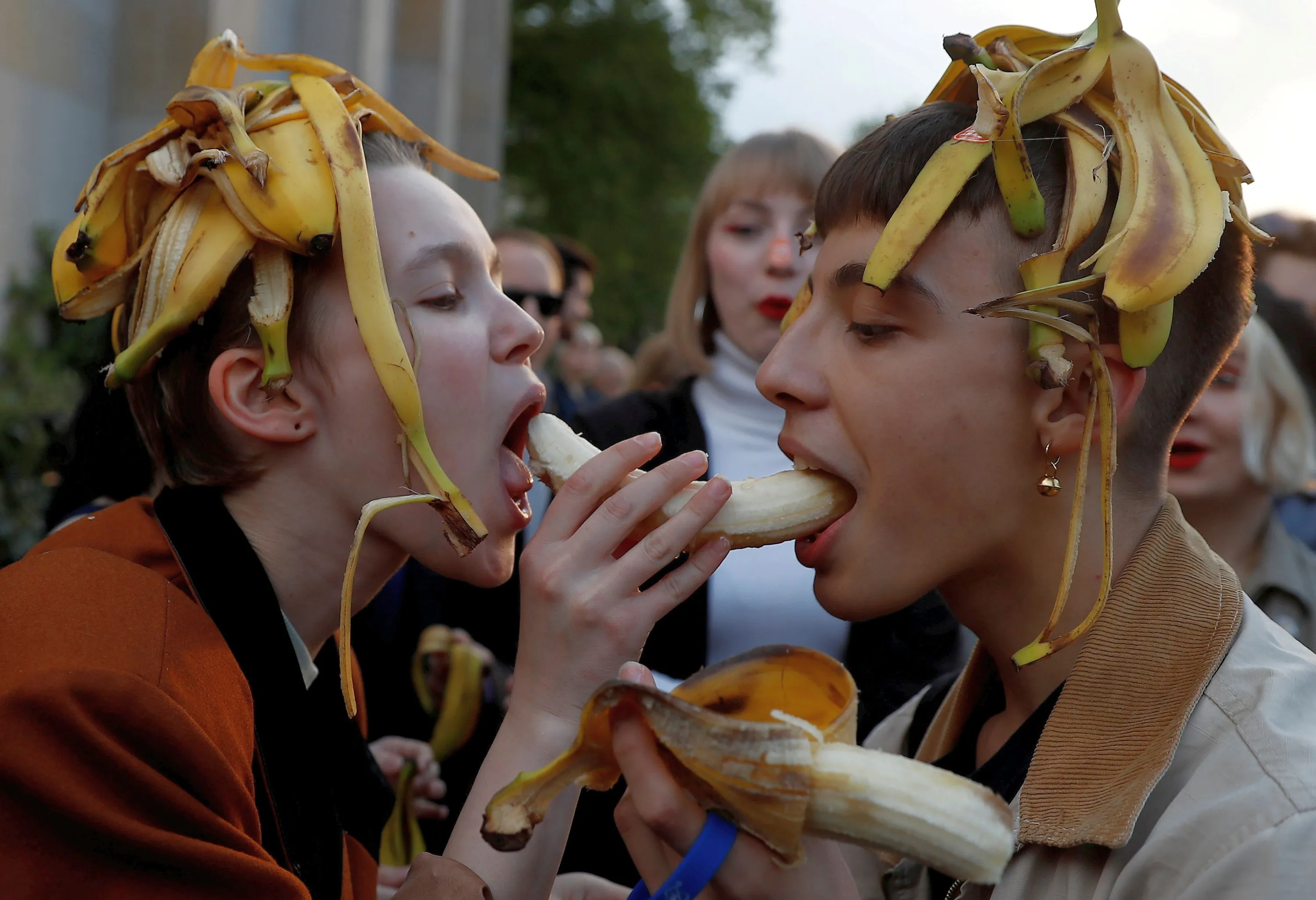 People eat bananas during a protest against perceived censorship by Poland's National Museum in front of the National Museum in Warsaw, Poland on April 29, 2019. (Photo by Kacper Pempel/Reuters)