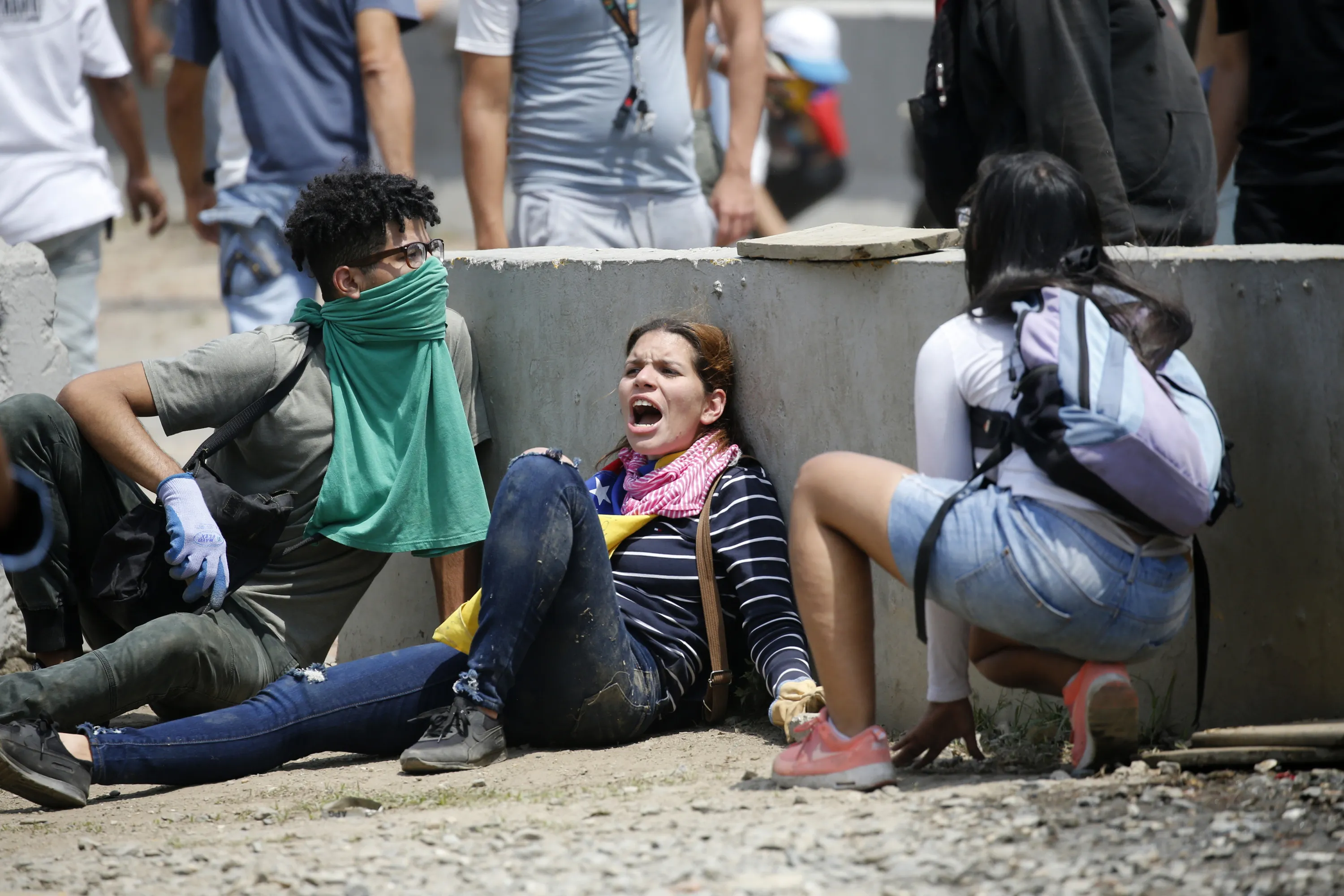 Anti-government protesters take cover during clashes with security forces who are firing tear gas from La Carlota airbase in Caracas, Venezuela, Wednesday, May 1, 2019. (Photo by Ariana Cubillos/AP Photo)