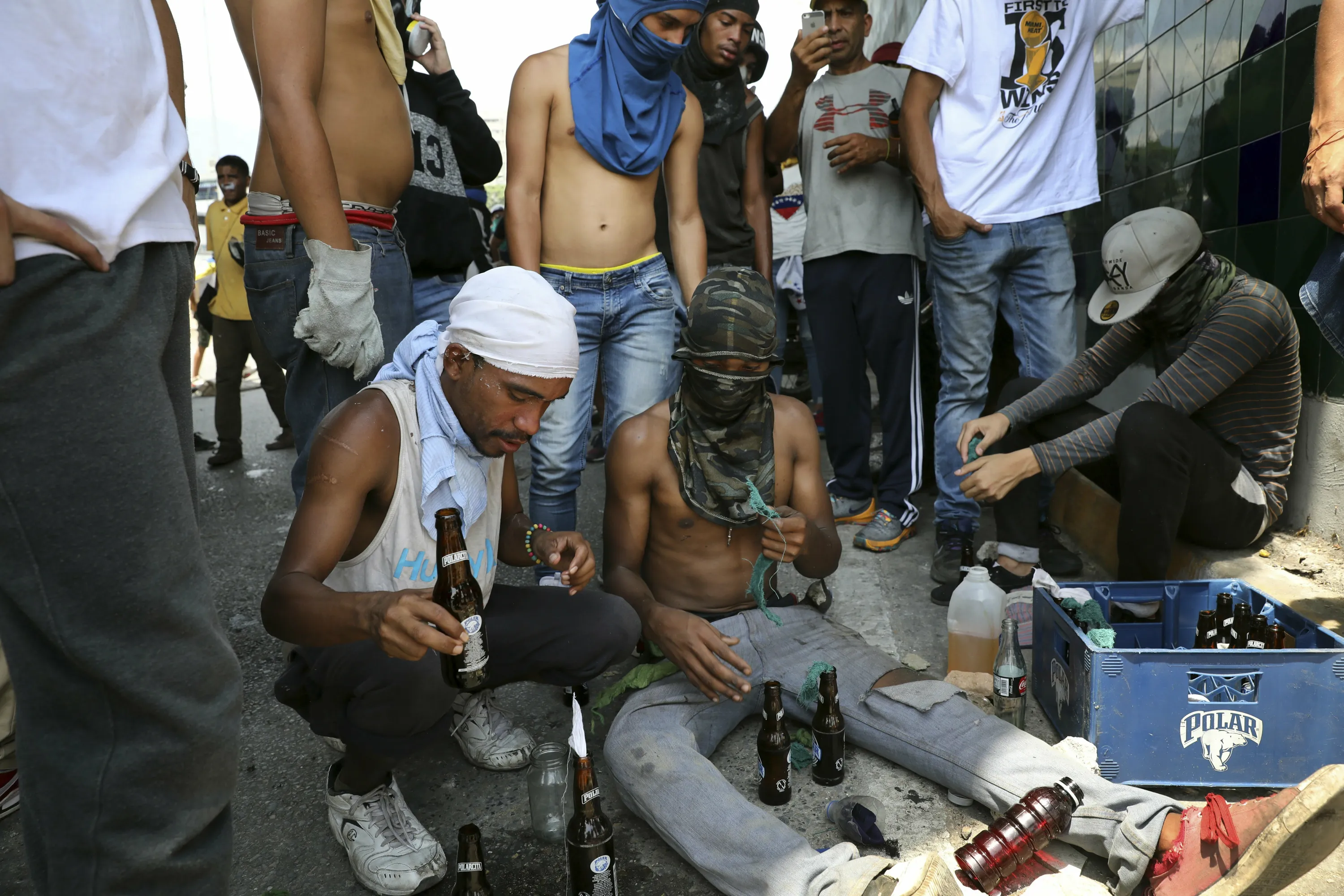 Anti-government protesters prepare molotov cocktails outside La Carlota airbase during clashes between the two sides in Caracas, Venezuela, Wednesday, May 1, 2019. (Photo by Rodrigo Abd/AP Photo)