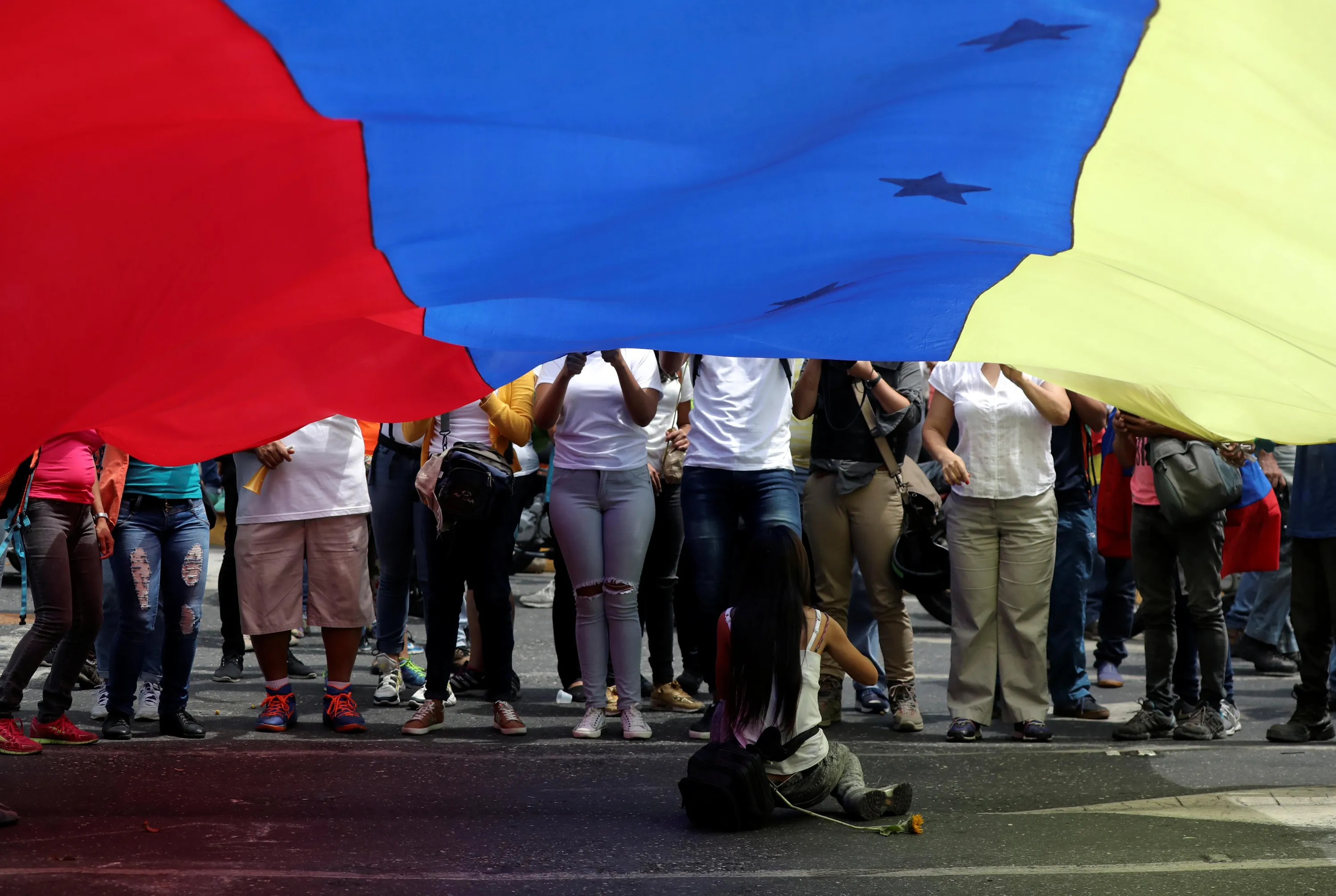 Supporters of Venezuelan opposition leader Juan Guaido, who many nations have recognized as the country's rightful interim ruler, hold a giant Venezuelan flag as they take part in a rally against the government of Venezuela's President Nicolas Maduro and to commemorate May Day in Caracas, Venezuela on May 1, 2019. (Photo by Manaure Quintero/Reuters)