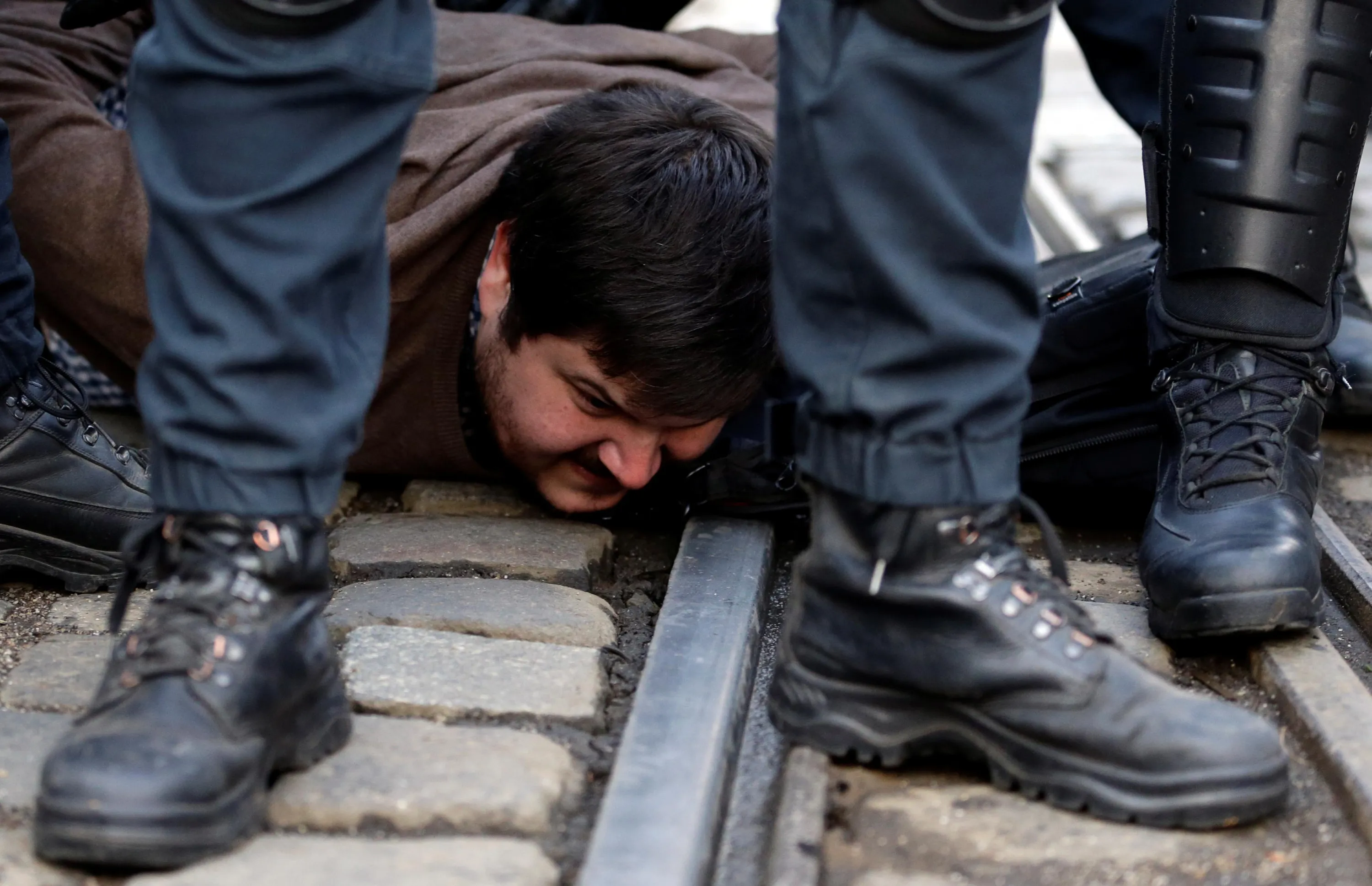 Czech riot police officers detain a protester during a May Day rally in Brno, Czech Republic on May 1, 2019. (Photo by David W. Cerny/Reuters)
