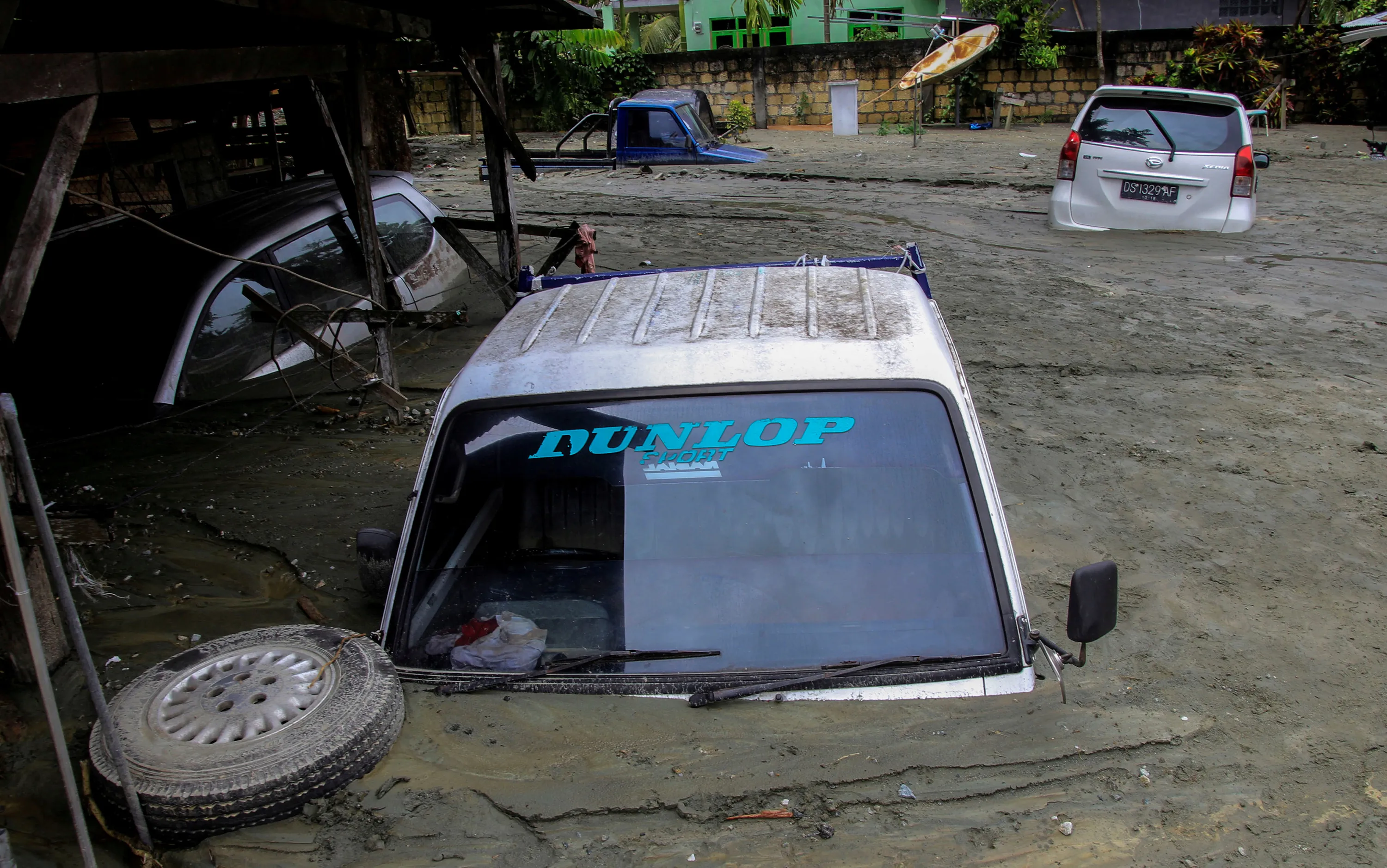 Cars are submerged in mud following a flash flood in Sentani, Papua, Indonesia, March 17, 2019 in this photo taken by Antara Foto. (Photo by Gusti Tanati/Antara Foto via Reuters)