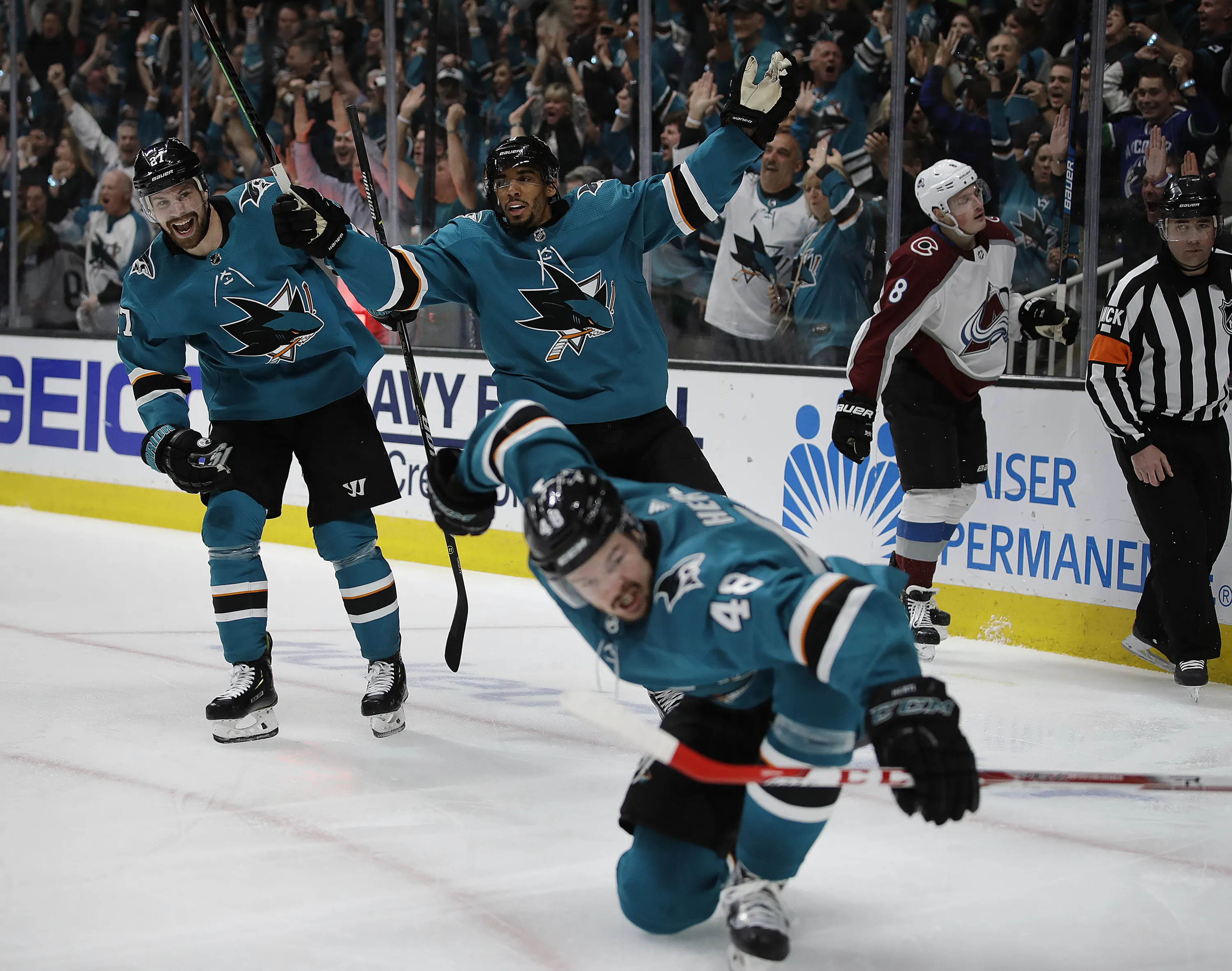 San Jose Sharks' Joonas Donskoi, left, and Evander Kane celebrate a goal by Tomas Hertl (48) during the third period of Game 5 of the team's NHL hockey second-round playoff series against the Colorado Avalanche on Saturday, May 4, 2019, in San Jose, Calif. (Photo by Ben Margot/AP Photo)