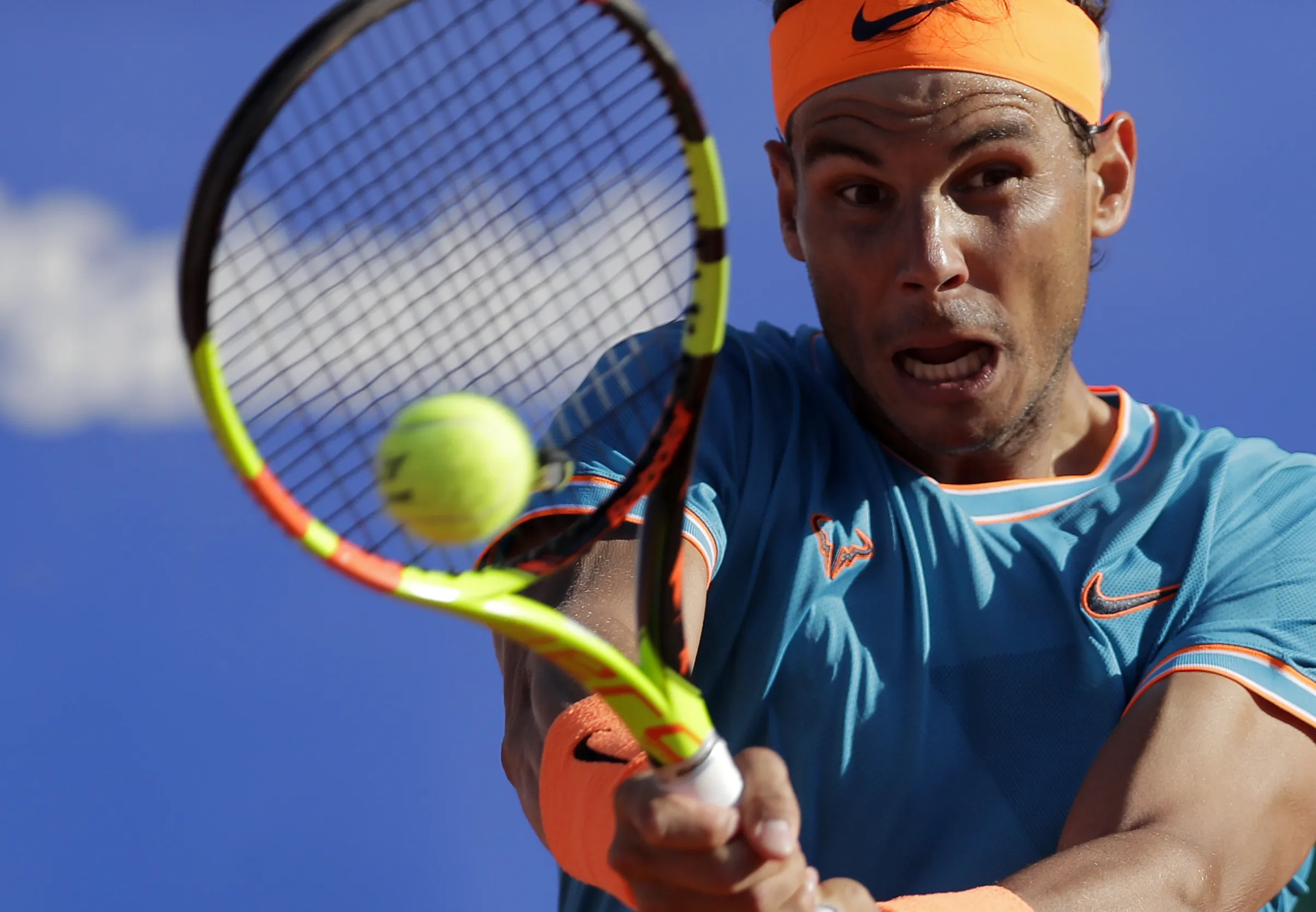 Spain's Rafael Nadal returns the ball to Austria's Dominic Thiem during their semifinal match at the Barcelona Open Tennis Tournament in Barcelona, Spain, Saturday, April 27, 2019. (Photo by Manu Fernandez/AP Photo)